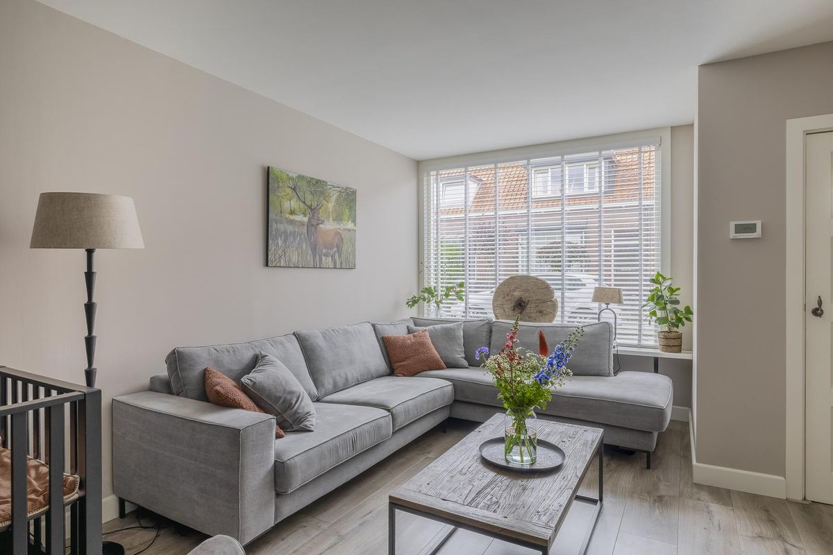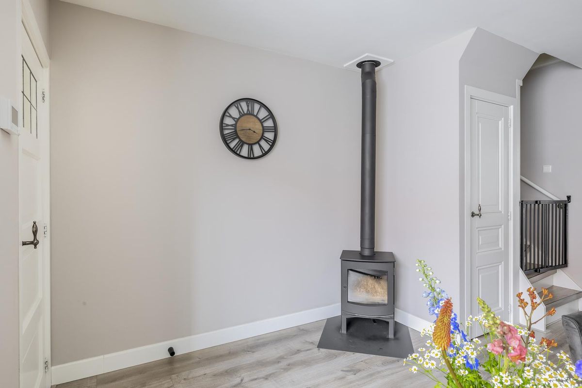 De lichte woonkamer is dankzij het grote raam aan de voorzijde erg uitnodigend en ruim van opzet. Hier is voldoende plek voor een gezellige zithoek. Onder de trap bevindt zich een praktische trapkast.