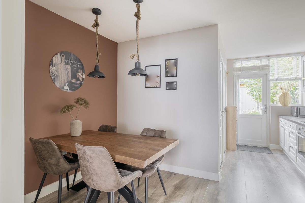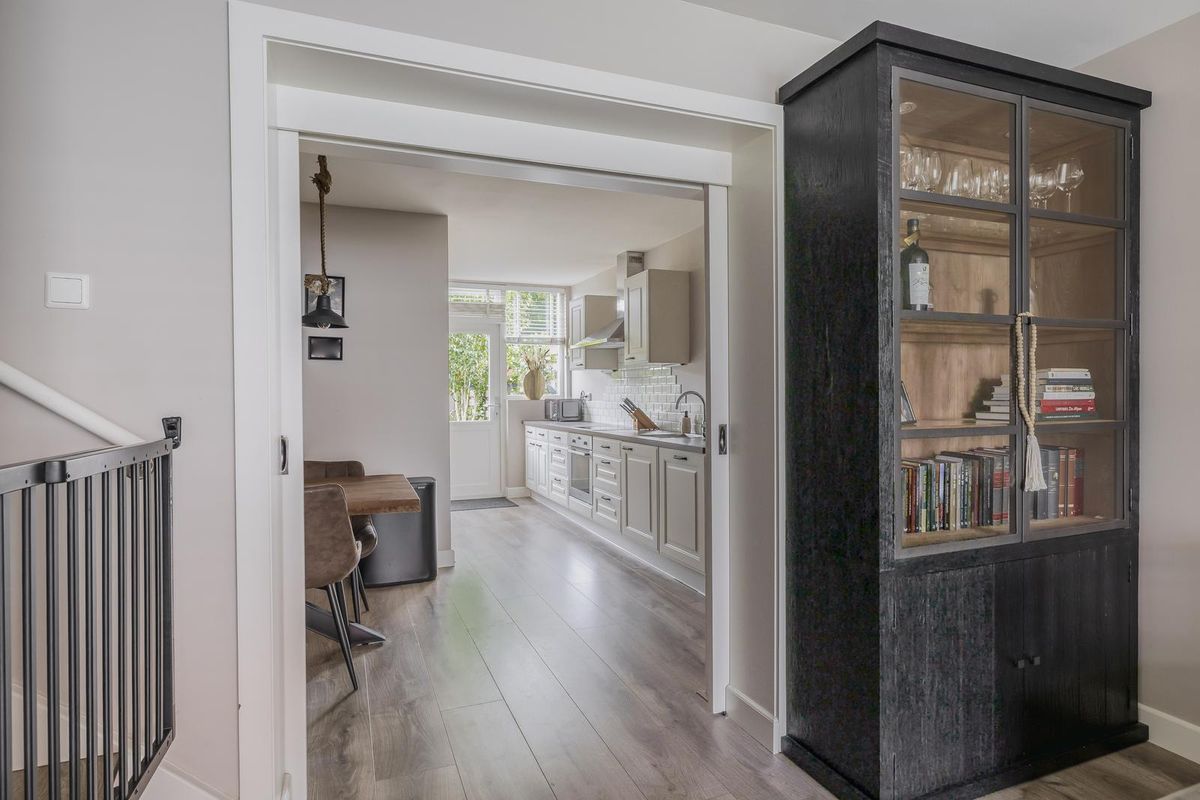 De ruime woonkeuken bevindt zich aan de achterzijde van de woning en biedt voldoende plaats voor een gezellige eettafel. De keuken heeft een moderne uitstraling en is uitgerust met diverse inbouwapparatuur, waaronder een inductiekookplaat, afzuigkap, oven, vaatwasser (2025) en koel-/vriescombinatie. Er is daarnaast meer dan genoeg kastruimte. Via de achterdeur bereikt u de verzorgde achtertuin met veel privacy.