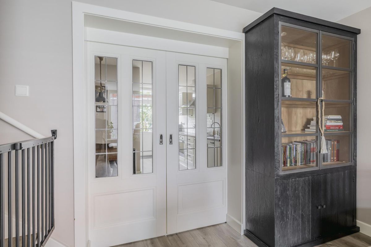 De en-suite schuifdeuren verdelen de living op een sfeervolle manier in twee aparte ruimtes, waardoor het woon- en eetgedeelte van elkaar gescheiden zijn terwijl de openheid van de ruimte behouden blijft.