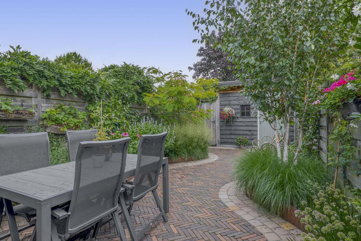 De fraai aangelegde achtertuin is gelegen op het zuidoosten, waardoor je optimaal profiteert van de ochtend- en middagzon. De tuin is grotendeels bestraat, wat zorgt voor een onderhoudsvriendelijke basis, maar beschikt ook over borders met aarde voor een groene uitstraling. Dankzij de royale afmetingen is er volop ruimte om een comfortabele zithoek te creëren. Achterin de tuin bevindt zich een praktische houten berging. Deze berging is in 2023 gebouwd en volledig geïsoleerd. De tuin is tevens bereikbaar via een achterom.