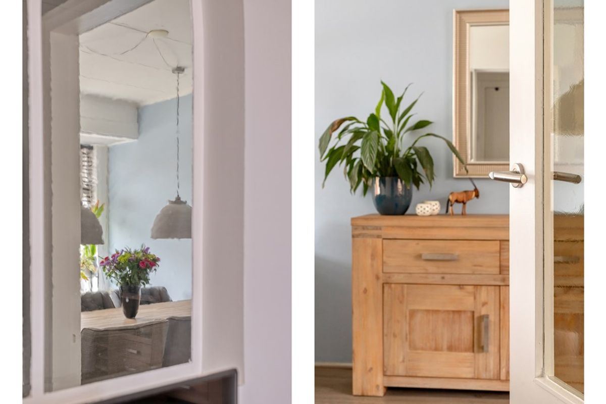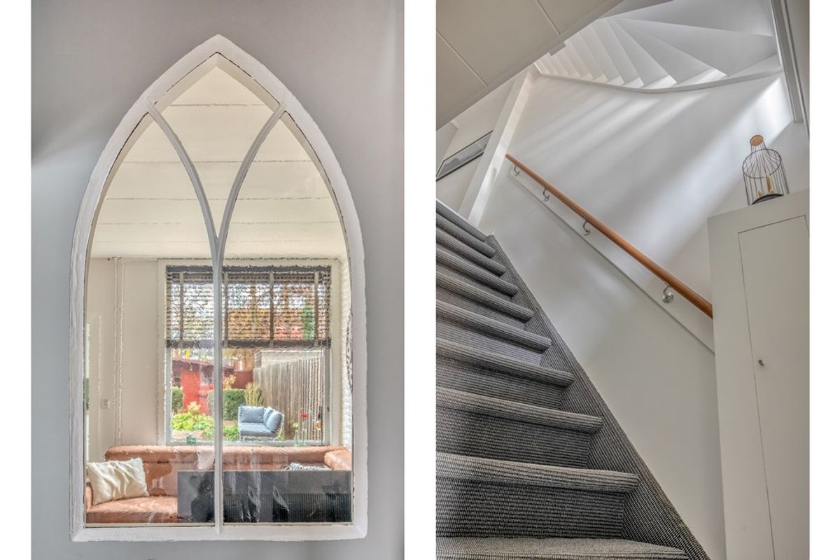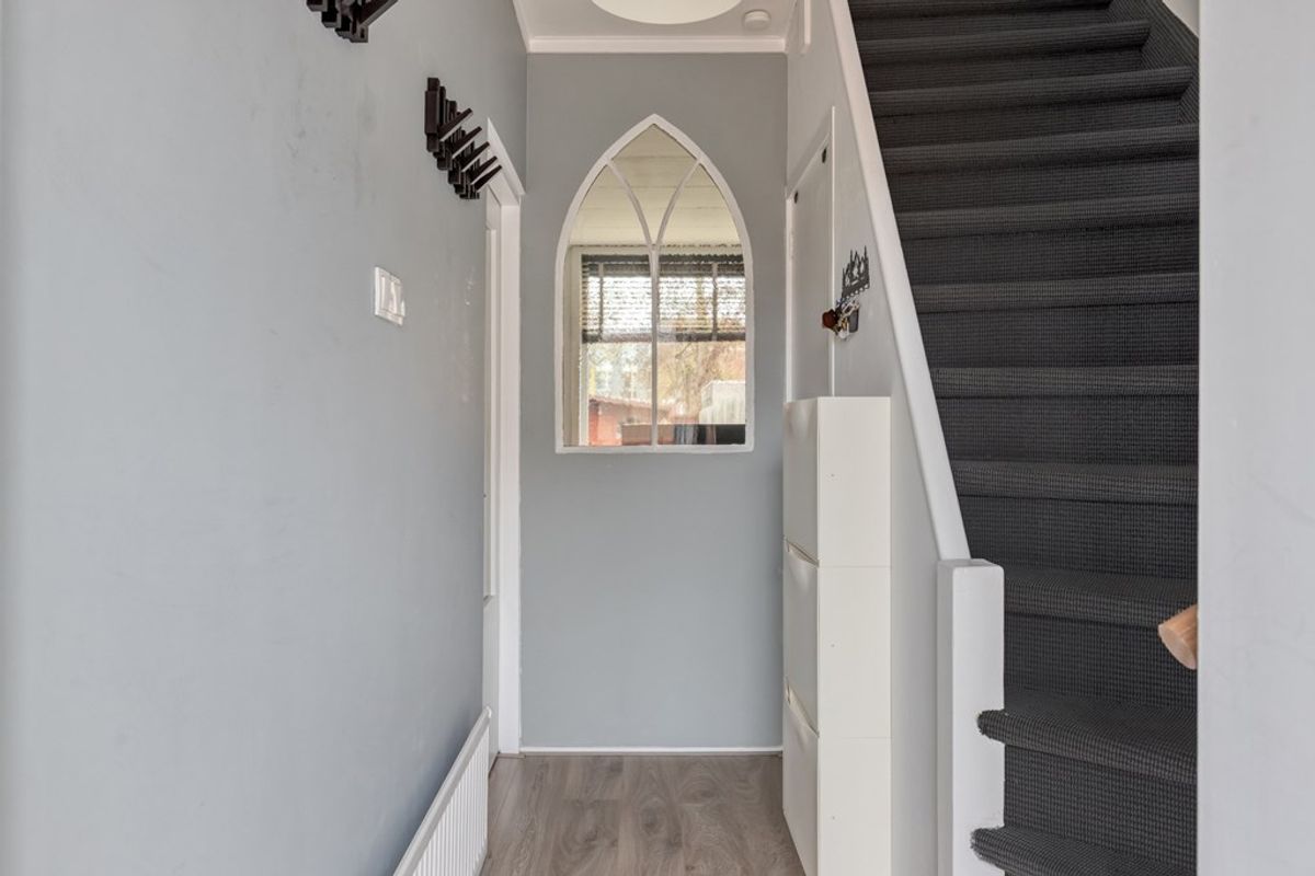 Met trap naar de verdieping, kelderkast en toegang tot de woonkamer. Leuk detail is het fraaie raam wat zorgt voor extra daglicht in de woonkamer.