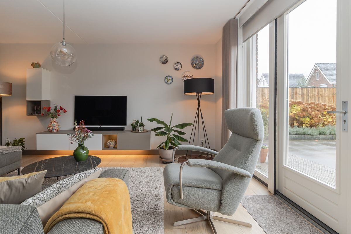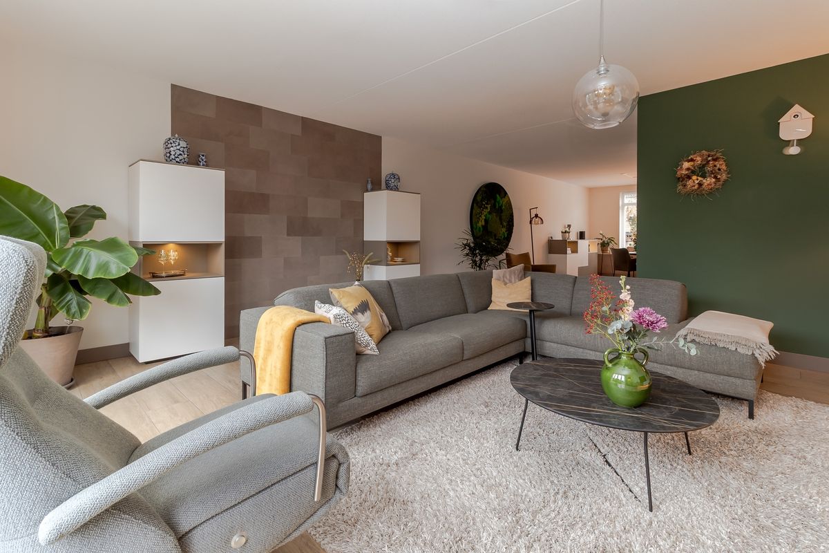 • Ruime L-vormige woonkamer (circa 44 m2) met voldoende ruimte voor het plaatsen van een gezellig zit- en t.v.-hoek. De woonkamer is aan de achterzijde voorzien van een pui met openslaande tuindeuren. Een praktische trapkast zorgt voor extra bergruimte.