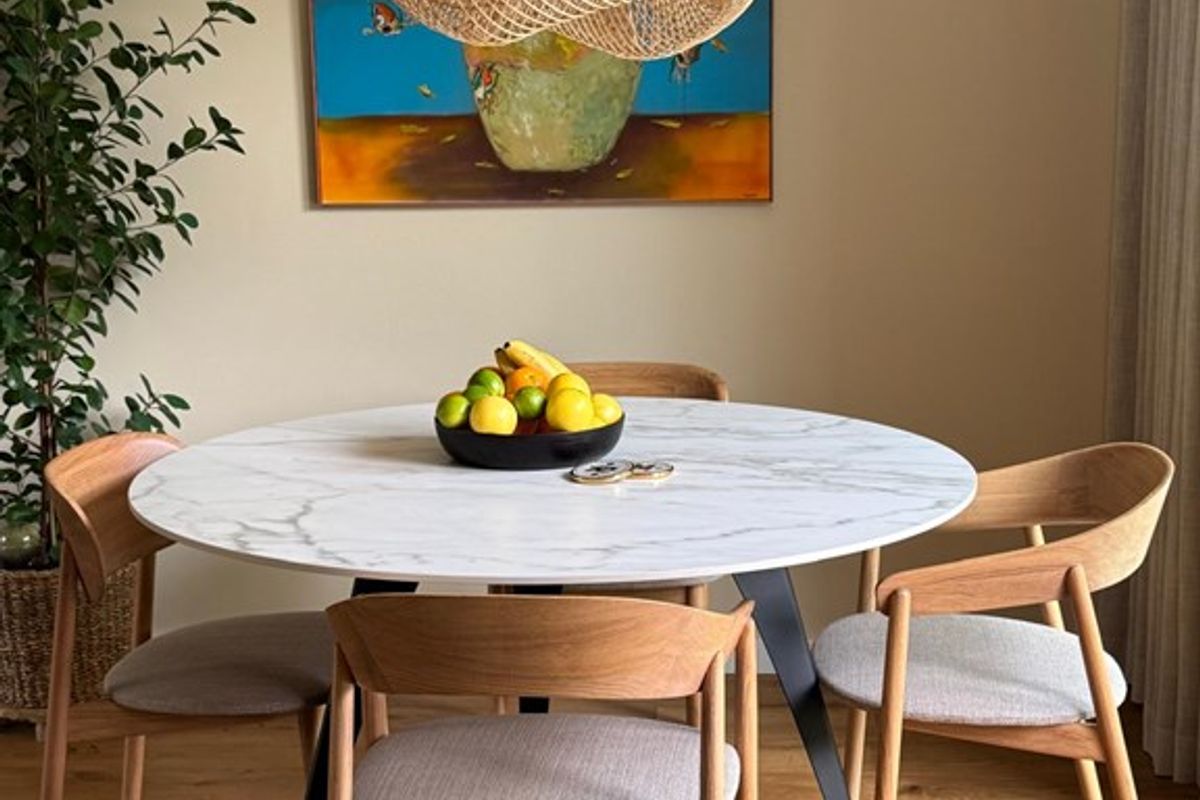 Enter through a spacious hallway with guest toilet, leading to a large living room with plenty of natural light and an open-plan kitchen. The warm wooden floors and modern kitchen with built-in appliances and designer furniture create a welcoming and functional living space. From the dining area, enjoy views of the sunny backyard, equipped with a fly screen door and tasteful window coverings.