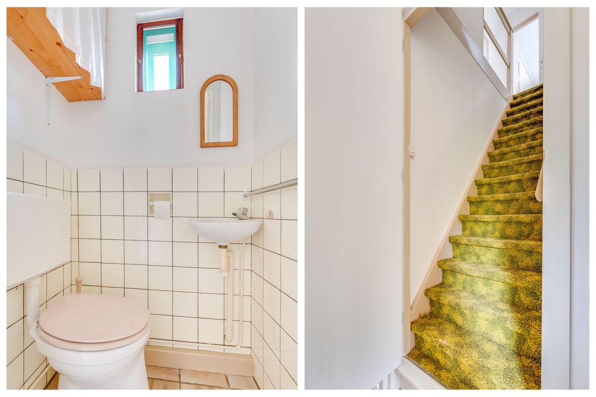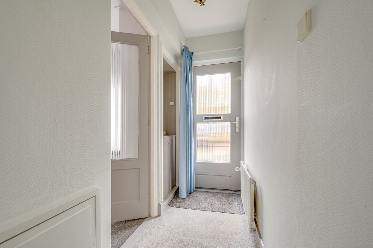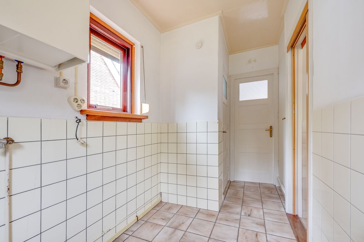 De begane grond beschikt over een sfeervolle woonkamer met veel lichtinval, een keuken met aansluitend een bijkeuken en apart toilet, en een slaapkamer op de begane grond, ideaal voor gelijkvloers wonen. In de hal bevindt zich de trapopgang naar de eerste verdieping.