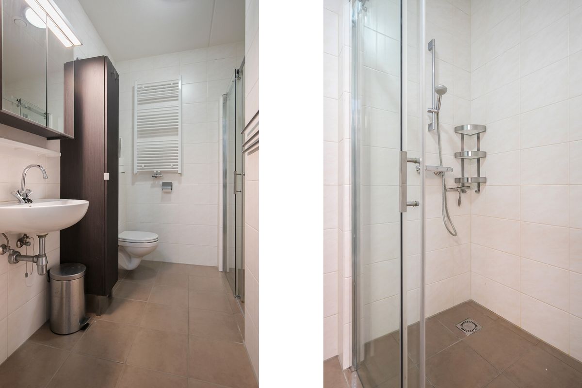 De badkamer is voorzien van een ruime douche, wastafel en 2e toilet.