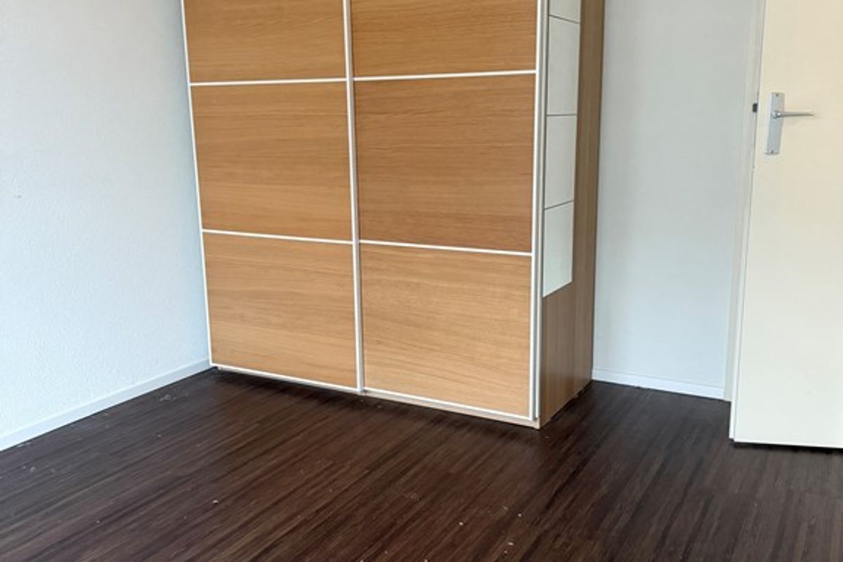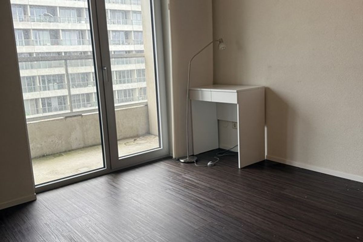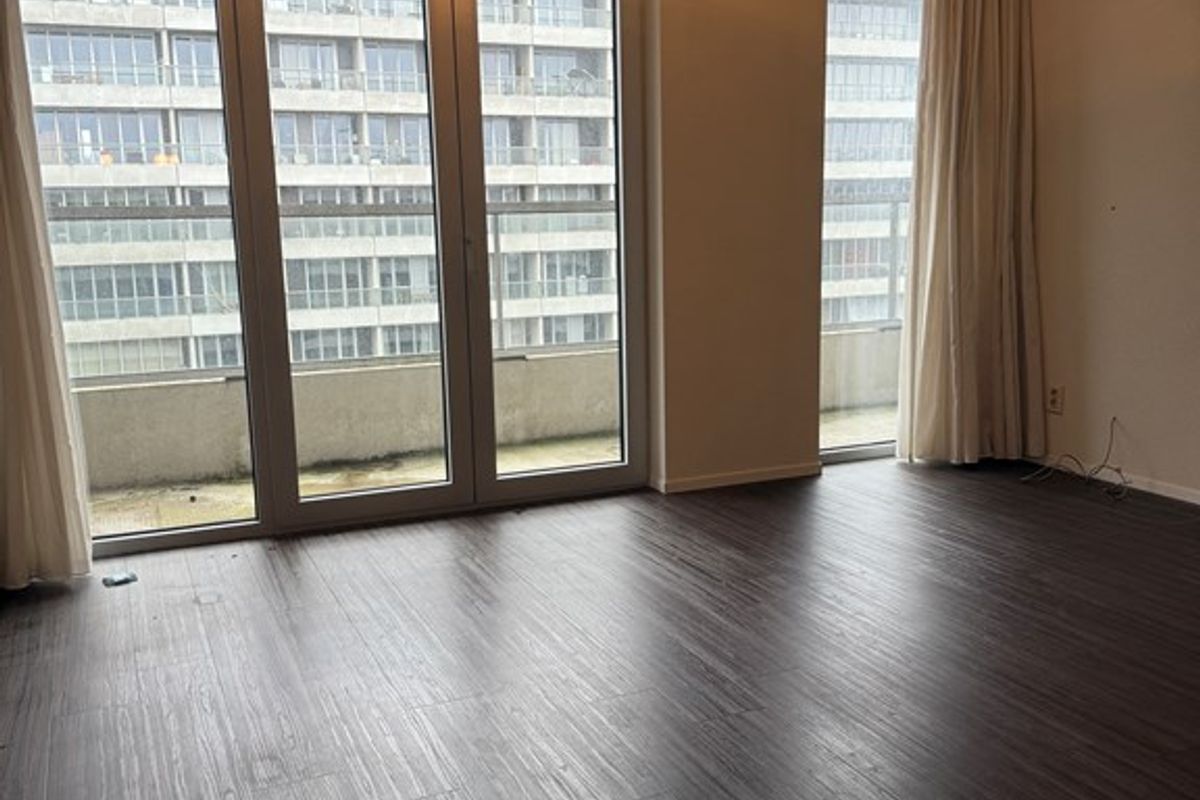 The façade side largely consists of tall windows with two doors opening onto the balcony. From the living room there is access to the bedroom. The bedroom is also finished with a wood-look PVC floor, plastered walls and a spray-finished ceiling. This room also borders the balcony and has a large window and a door.