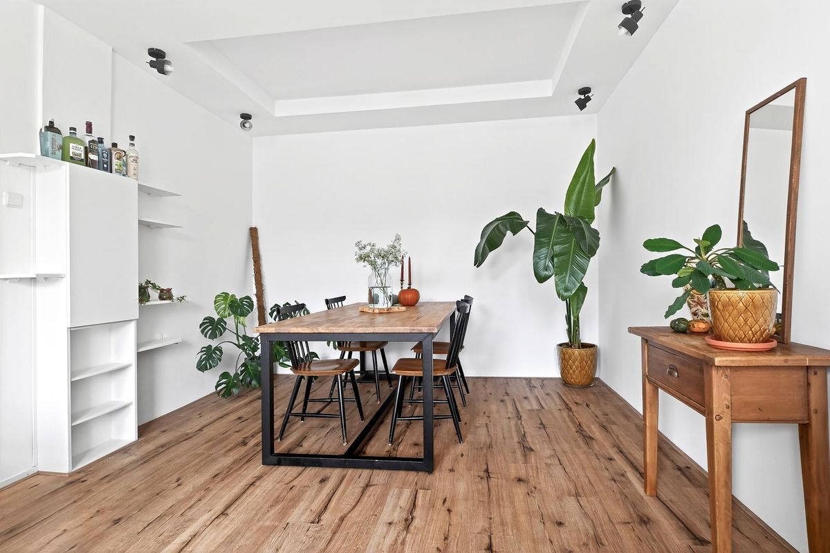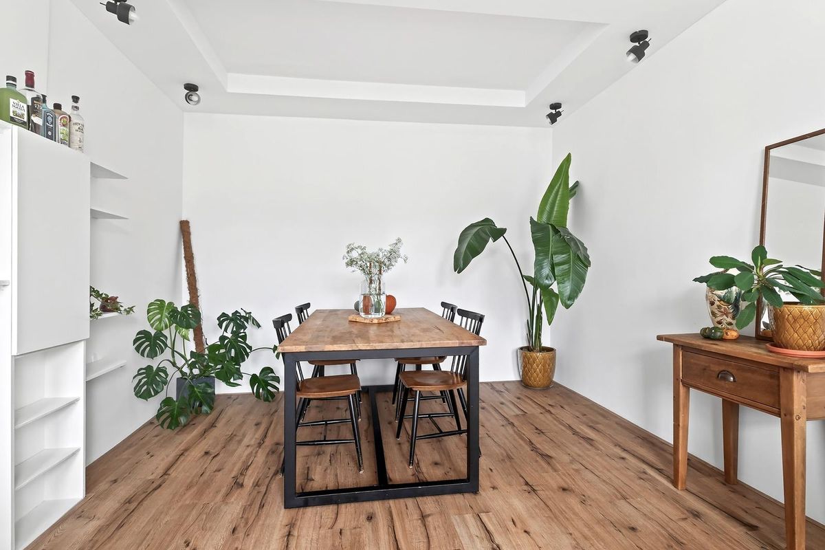 Op de tweede verdieping bevindt zich de eetkamer met toegang tot het balkon, gelegen op het noordoosten – een heerlijke plek voor een kop koffie in de ochtendzon. Aan de achterzijde bevinden zich tevens de keuken en een toilet. Aan de voorzijde van deze verdieping ligt de ruime woonkamer, die dankzij de grote raampartijen én de royale plafondhoogte van ca. 2,80 m een bijzonder lichte en open sfeer heeft. Direct naast de woonkamer ligt een extra slaap- of werkkamer, ideaal voor thuiswerken of als logeerplek.