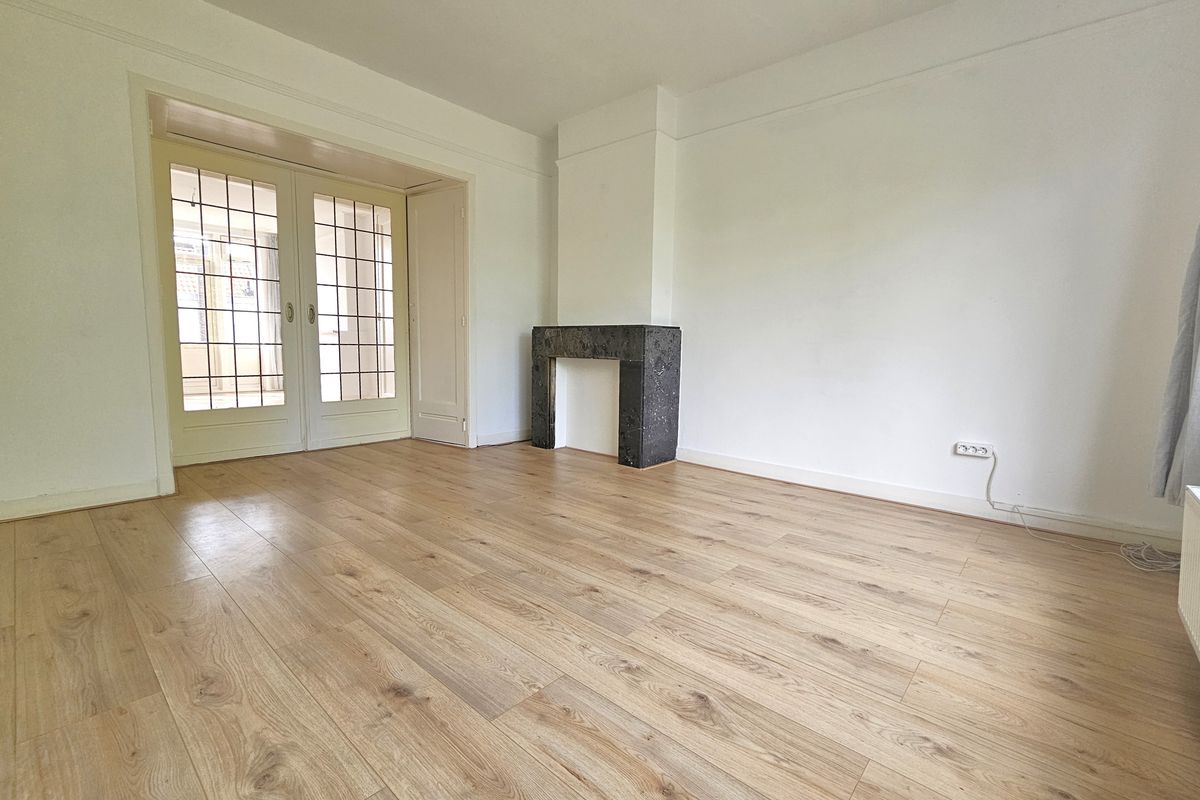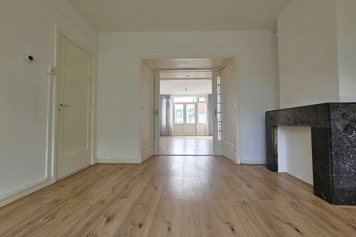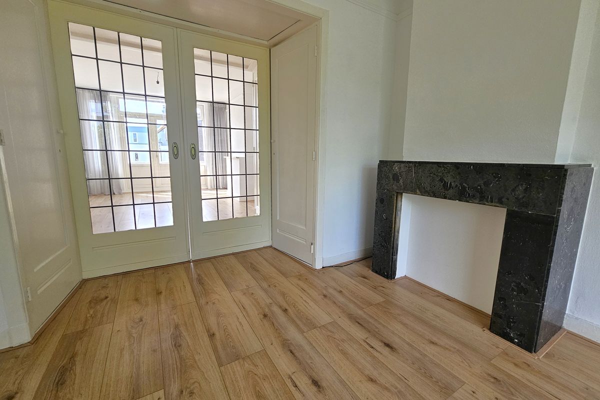 Sfeervolle woonkamer en suite met originele schuifdeuren voorzien van glas-in-lood en een klassieke schouw. De doorzonindeling zorgt voor veel licht en ruimte.