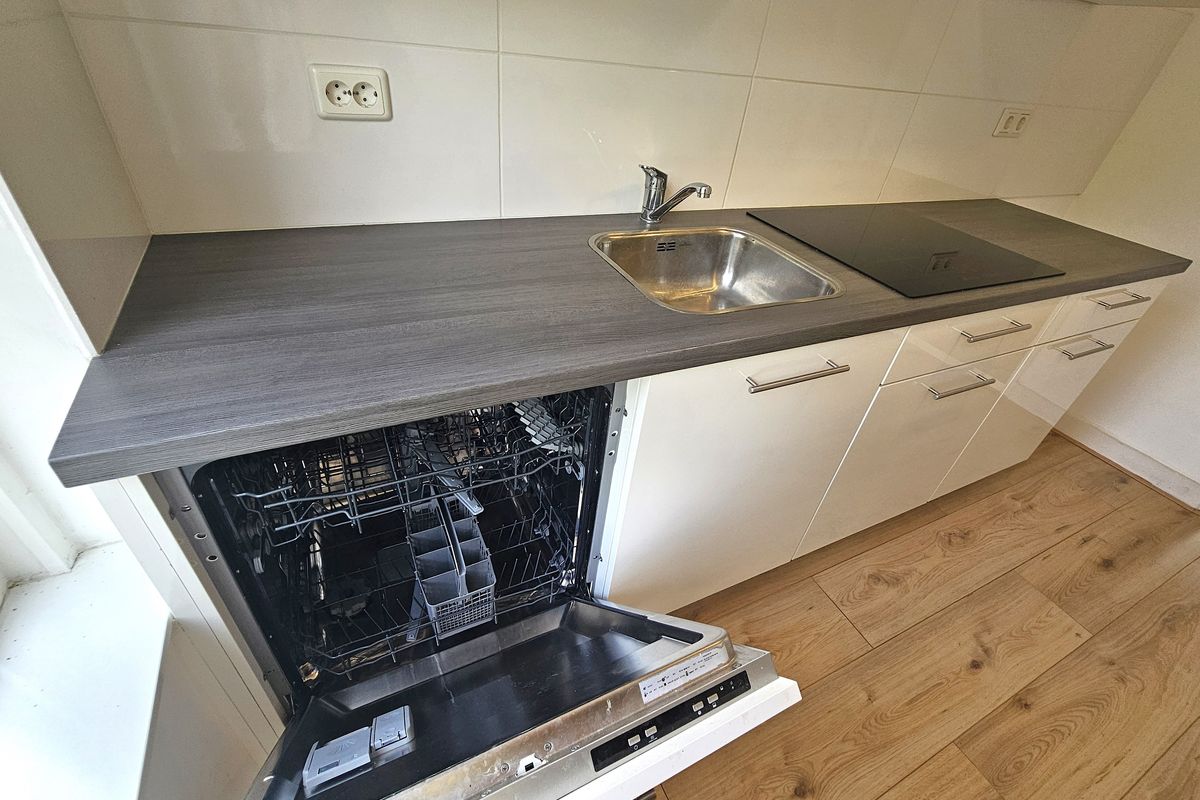 Moderne keuken met inductiekookplaat, vaatwasser, afzuigkap en strak werkblad. Vanuit de keuken kijk je uit op het groen.