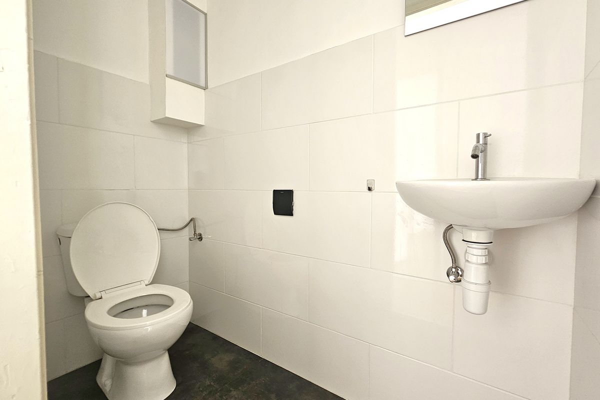Ruime separate toiletruimte, strak betegeld en met fontein, apart van de badkamer.