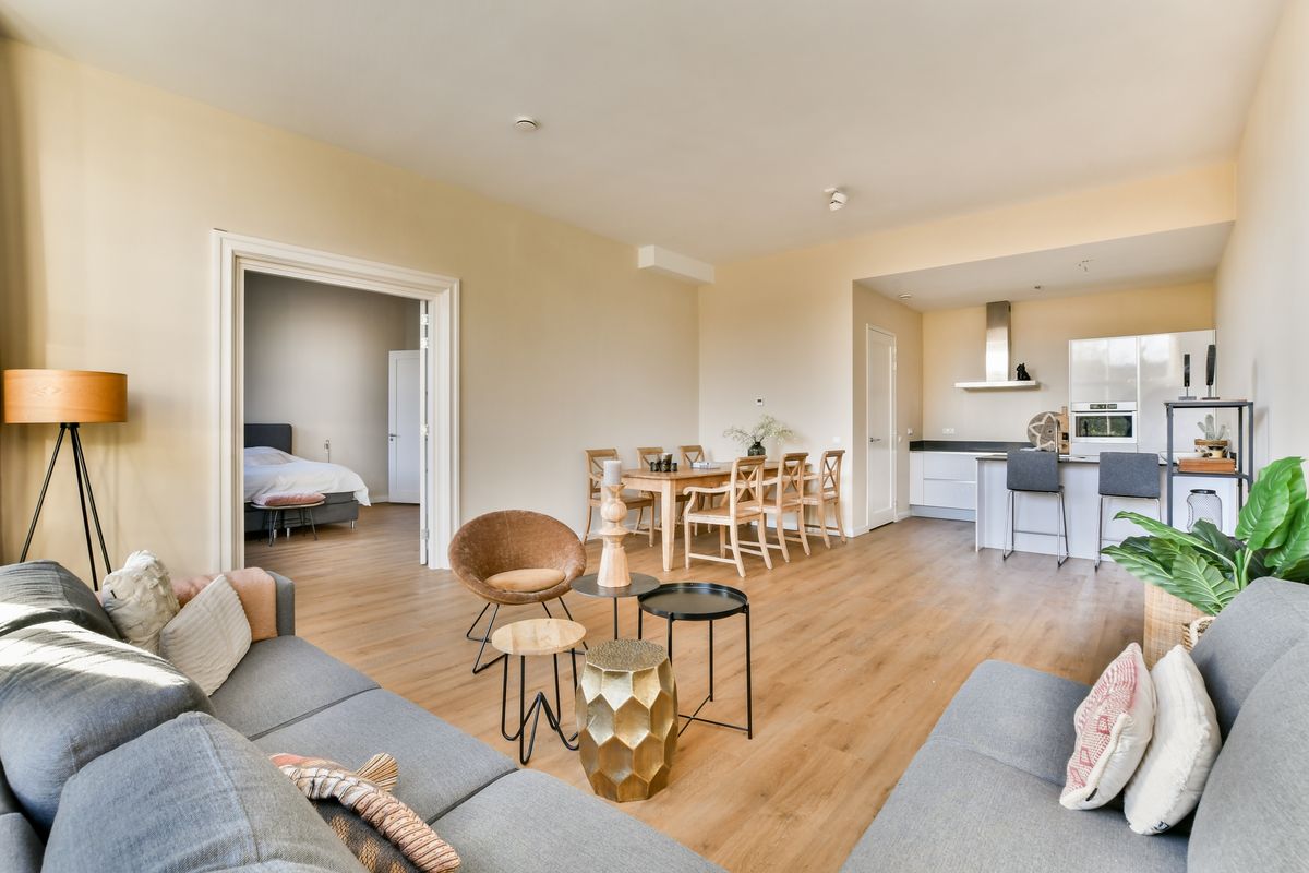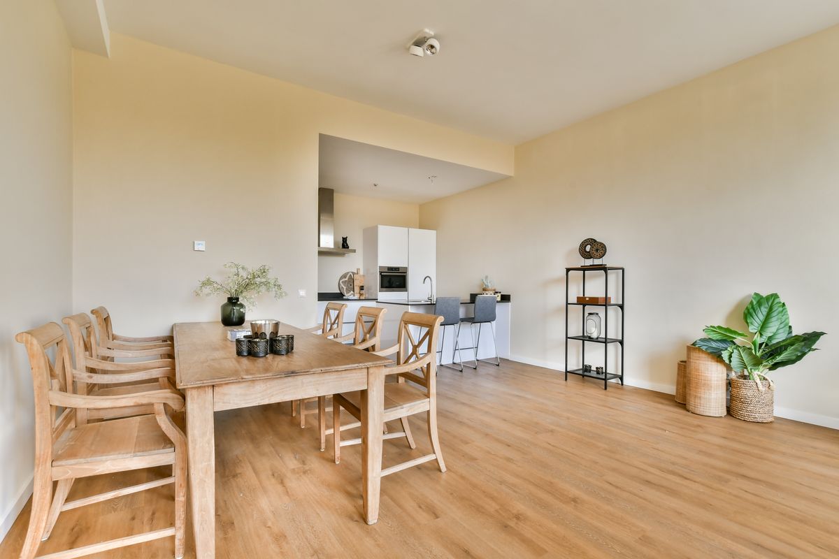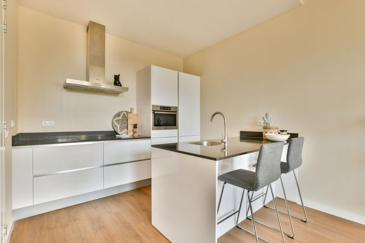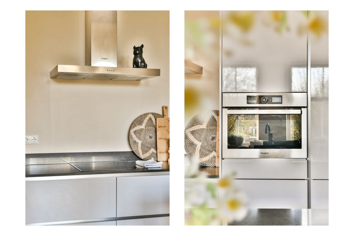 In de woonkamer bevindt zich de moderne open keuken, luxe uitgevoerd en voorzien van Whirlpool inbouwapparatuur: een koel-/vriescombinatie, inductiekookplaat, afzuigkap, combimagnetron/oven en vaatwasser. De keuken biedt veel werk- en kastruimte en is ontworpen om koken en gezellig samenzijn naadloos te combineren.