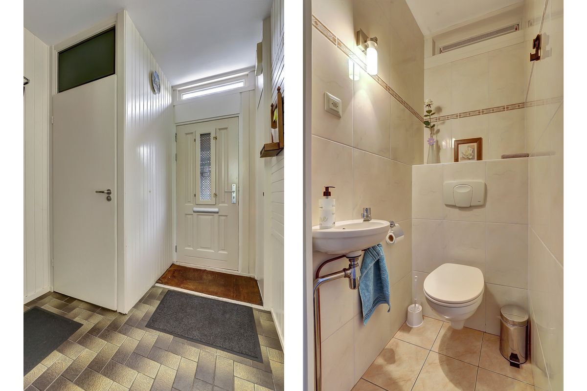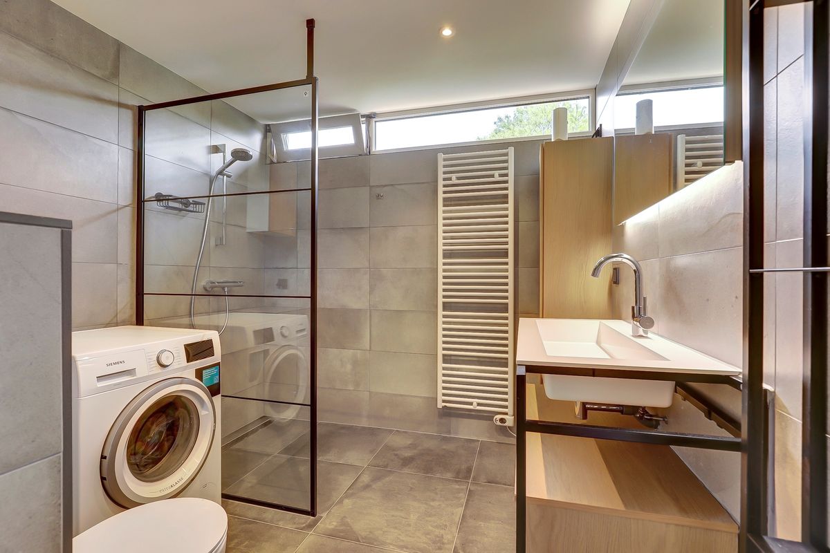 Achter de voordeur vinden we de hal met toiletruimte met zwevend toilet en fonteintje, de trap naar boven en toegangsdeuren naar de afgesloten keuken en de woonkamer. In de heerlijk lichte keuken in hoekopstelling is een combimagnetron en vaatwasser ingebouwd. Er is zelfs ruimte voor een ontbijttafel en je hebt vrij uitzicht over het tegenovergelegen veld.