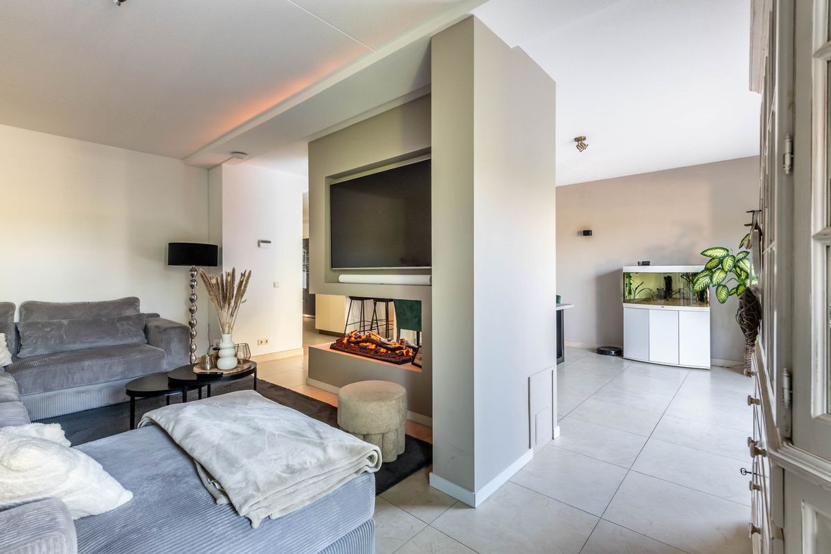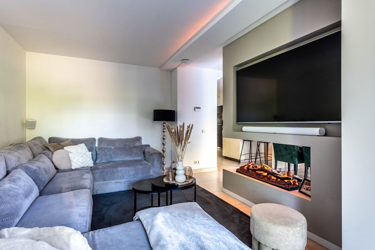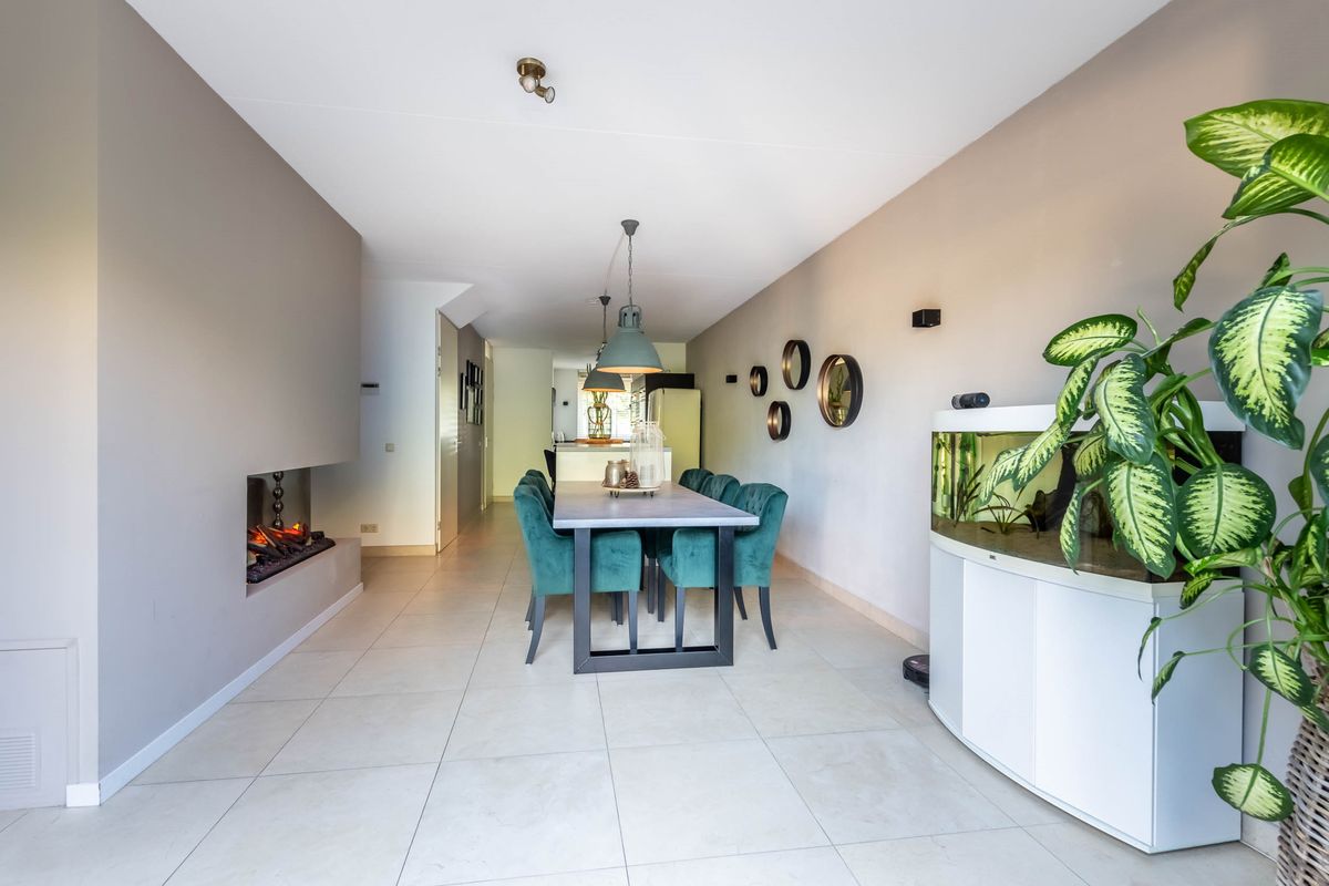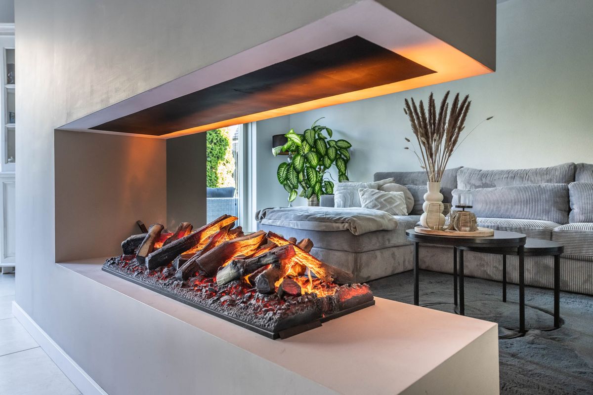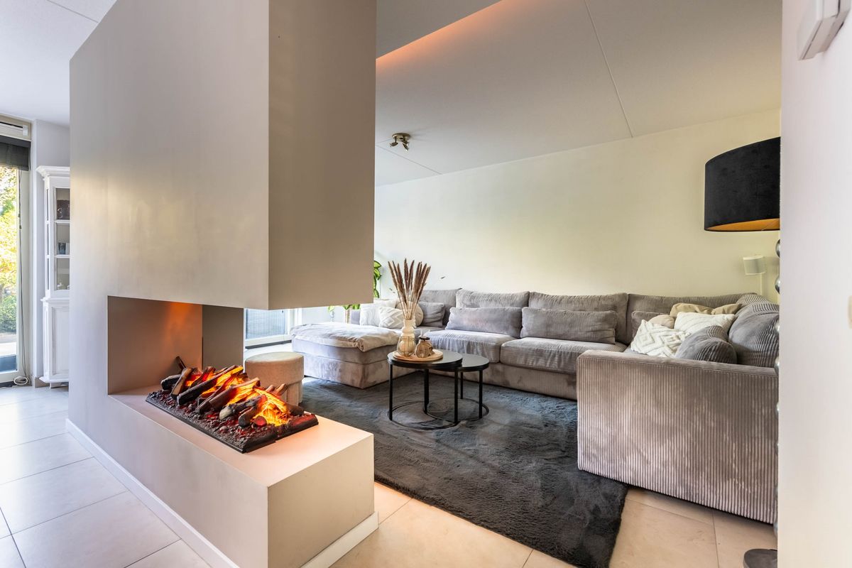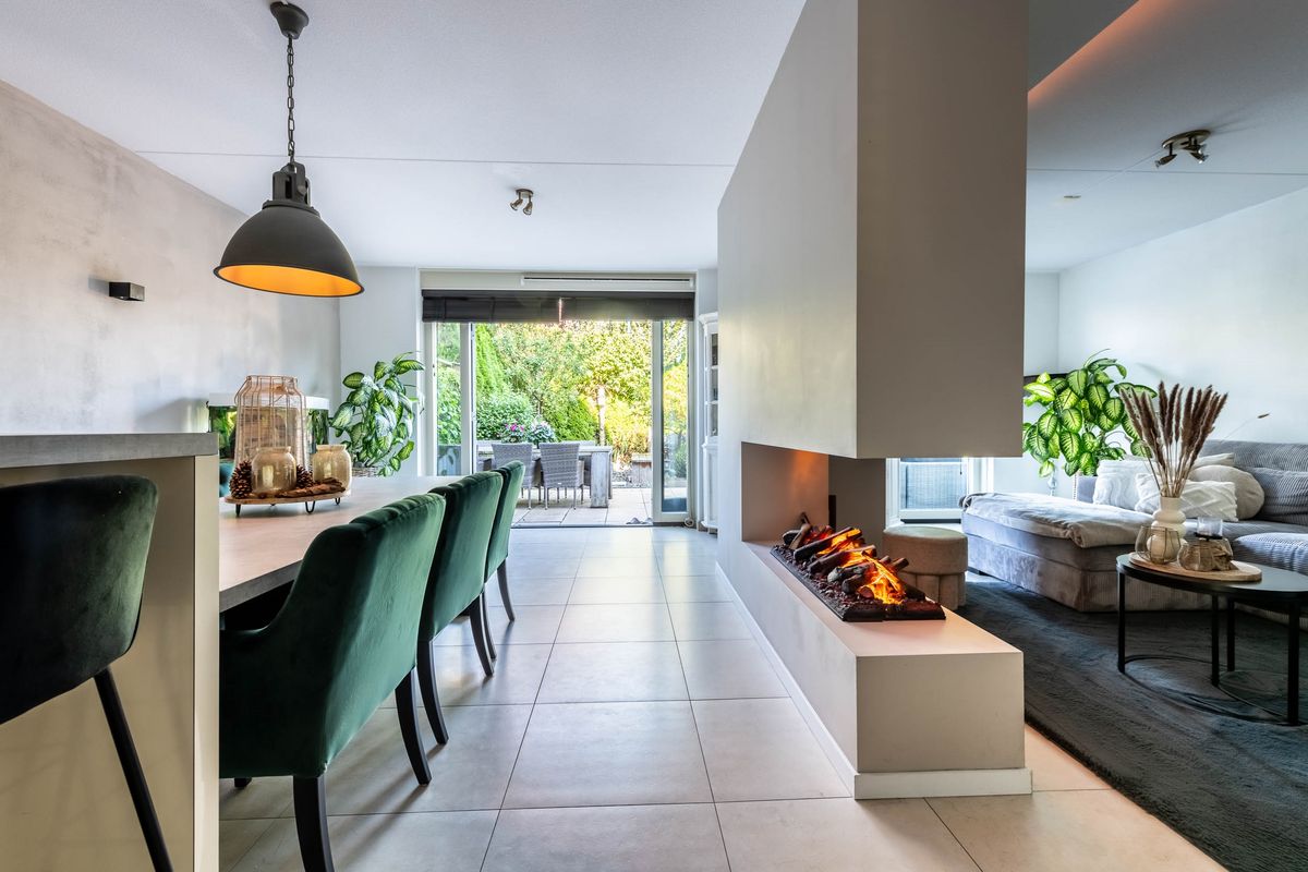 De tuingerichte woonkamer is royaal opgezet en biedt door de grote raampartijen een zee van daglicht. De ruimte is voorzien van een roomdivider met doorkijk waterdamphaard en een strakke cinewall, waardoor er een modern en sfeervol geheel is ontstaan. Hier kunt u in elk seizoen comfortabel genieten: met uitzicht op de tuin in de zomer of bij de haard in de winter. De gehele begane grond is voorzien van vloerverwarming.