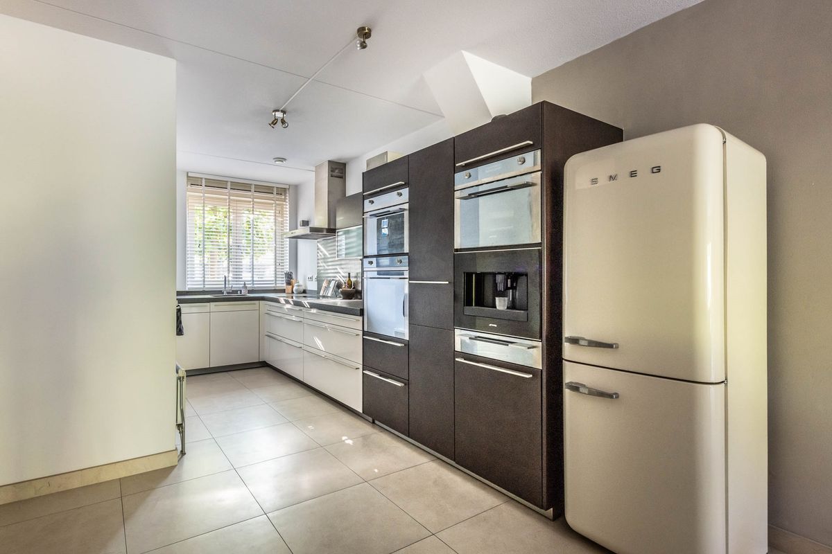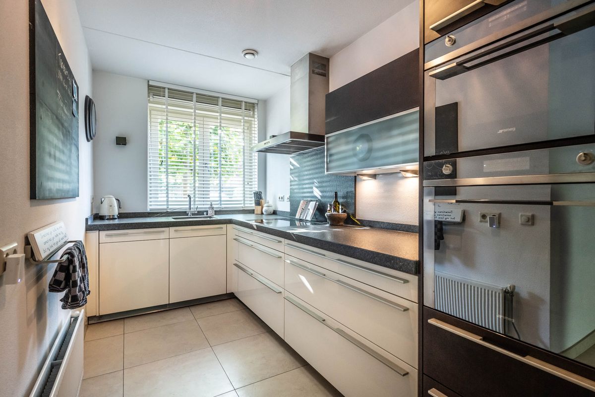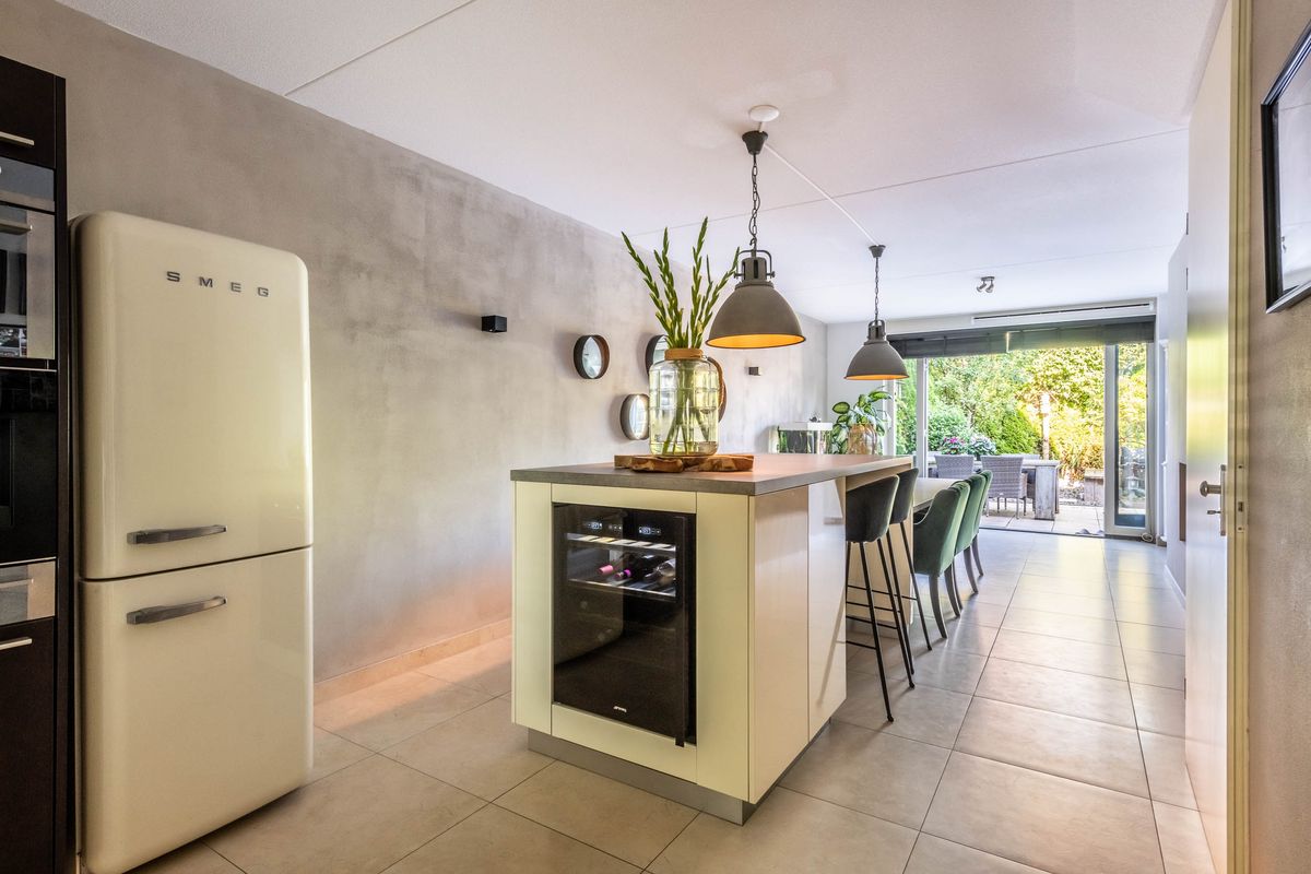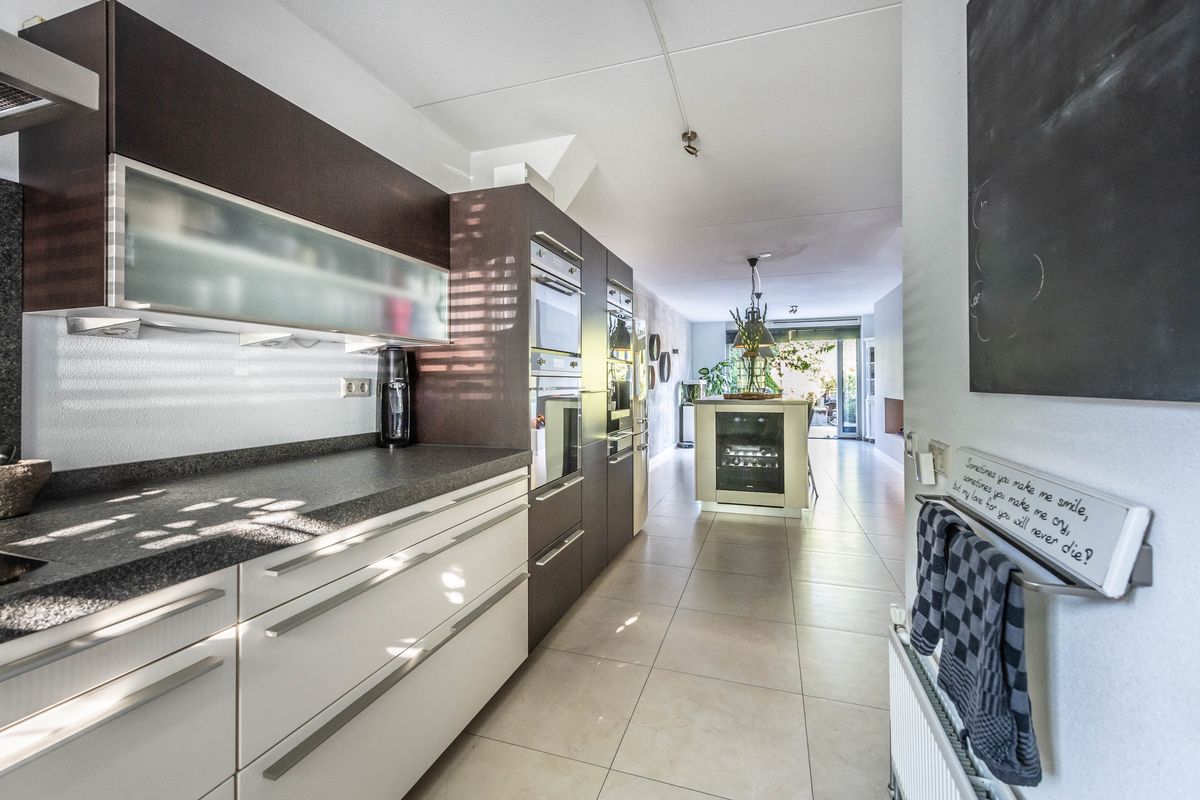 Aan de voorzijde van de woning bevindt zich de royale leefkeuken, ingericht met een eiland/eetbar. Deze keuken is uitgerust met hoogwaardige inbouwapparatuur, zoals een inductiekookplaat, een afzuigkap, een vaatwasser, een stoomoven, een oven, , een magnetron, een koffiemachine, een warmhoudlade en een wijnklimaatkast. De keuken biedt ruim voldoende werk- en bergruimte. De combinatie van het eiland met identiek werkblad aan de eettafel geeft de ruimte een rustige en luxe uitstraling. Hier is het een fijne plek om samen te koken, tafelen of borrelen.