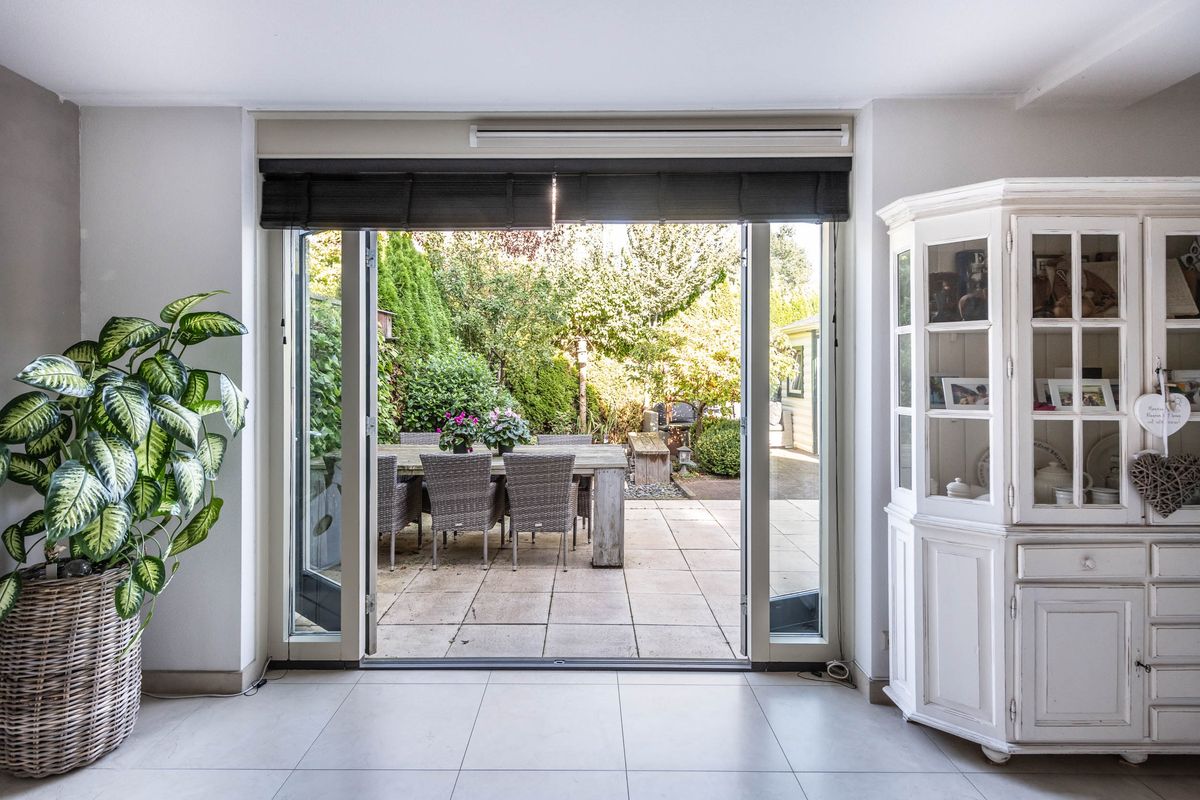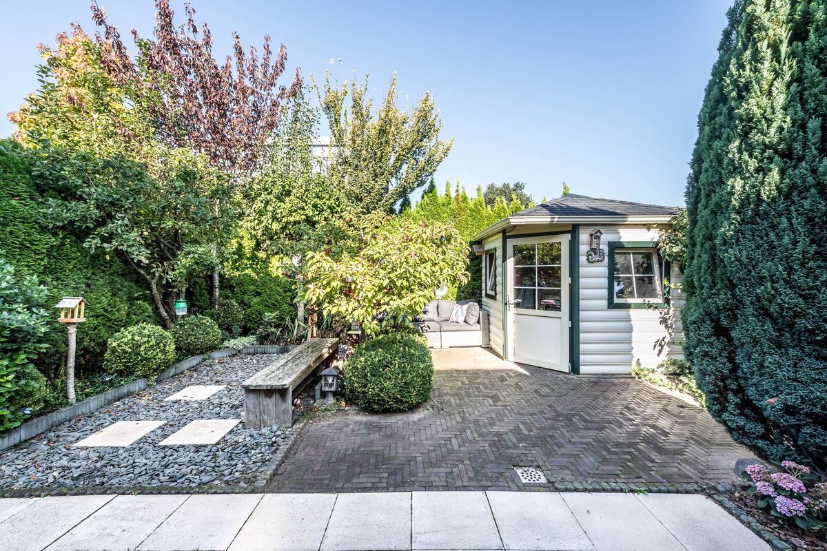 De achtertuin is fraai aangelegd en keurig onderhouden. Dankzij de verschillende terrassen en zithoeken is er altijd een plek in de zon of de schaduw te vinden. De brede zonwering biedt comfort tijdens warme zomerdagen. Achter in de tuin bevindt zich een vrijstaande kunststof berging, praktisch voor het stallen van fietsen of het opbergen van tuingereedschap en speelgoed. De tuin is tevens te bereiken via een achterom.
