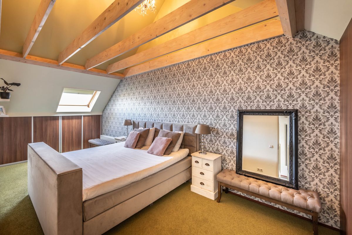 Op de eerste verdieping bevinden zich drie ruime slaapkamers. Aan de voorzijde een kamer over de volle breedte van de woning voorzien van rolluiken op zonne-energie, aan de achterzijde een gelijkwaardige kamer en als eyecatcher de masterbedroom boven de garage. Deze laatste kamer is voorzien van een hoge nok met zichtbare balken, een royaal dakraam en een ruime inloopkast.