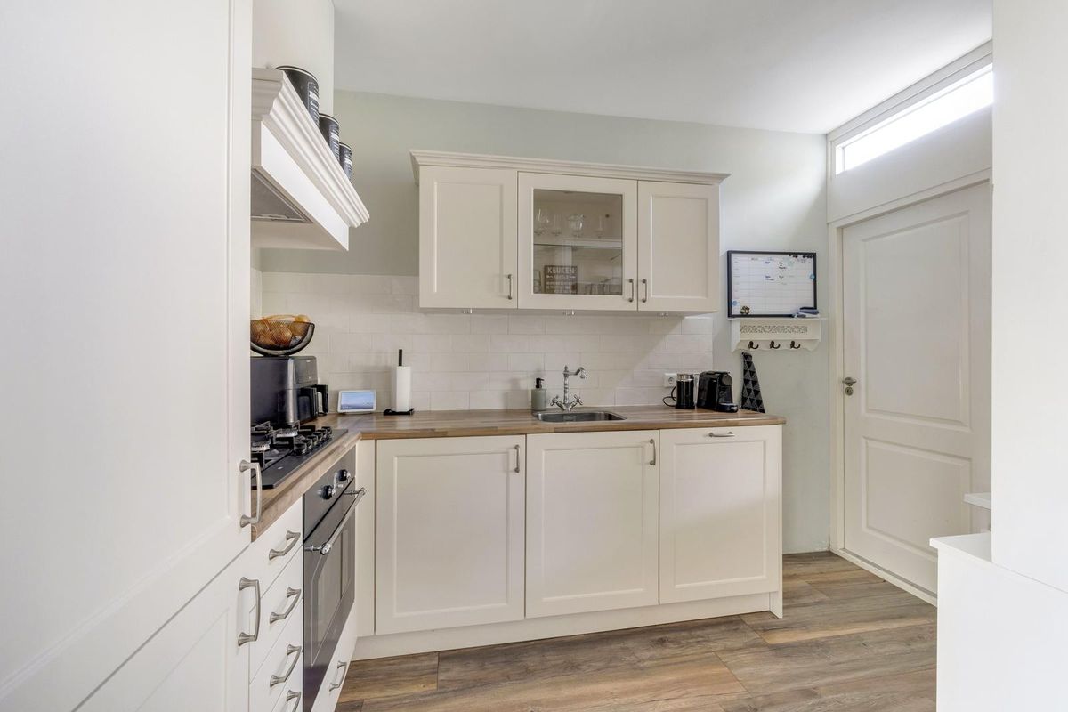 De keuken bevindt zich aan de achterzijde van de woning en beschikt over een hoekopstelling. Deze is uitgevoerd met een spoelunit, gaskookplaat, oven, vaatwasmachine en een koel/ vriescombinatie. Via de keuken komt u in de bijkeuken.