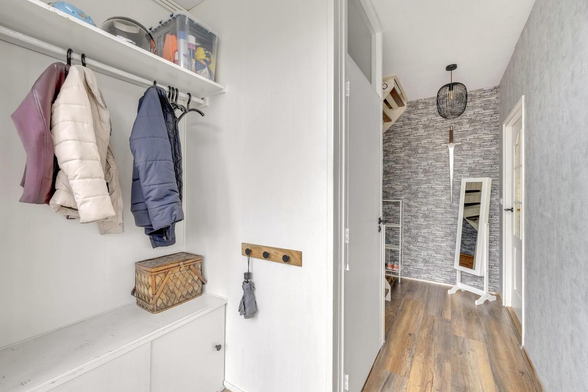 Entree/ hal met garderobe, moderne meterkast, eenvoudig toilet met fonteintje, trap naar de eerste verdieping en toegang tot de woonkamer.
