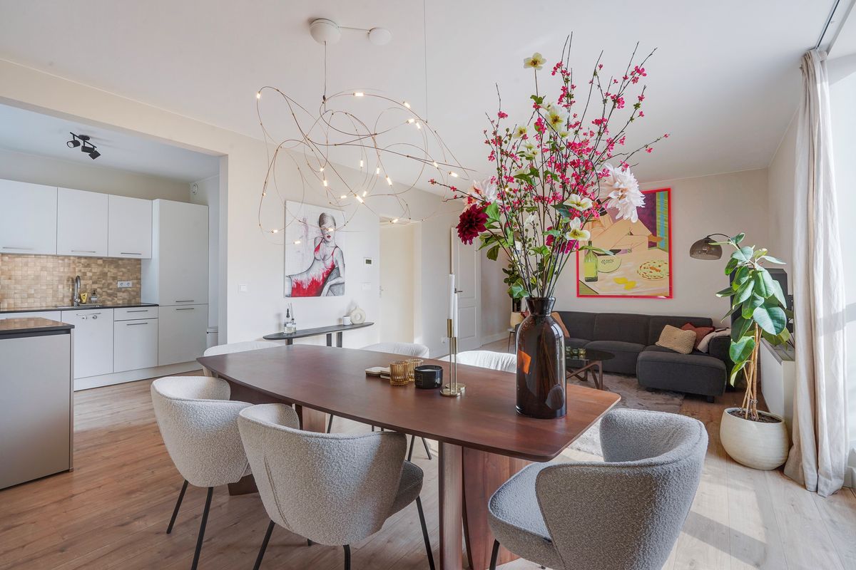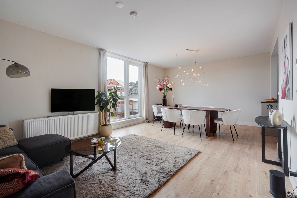 Through the entrance on the ground floor, you reach the first floor where there is a spacious separate bedroom. Via the staircase, you reach the second floor. Landing with entrance to the apartment. Hallway with access to a modern toilet with a small sink and a spacious, bright living room. From the living room, you enter the semi-open kitchen with new kitchen appliances and a separate storage and laundry closet. From the living room, you also access a sunny and spacious roof terrace (south-east). A second hallway from the living room provides access to 2 bedrooms and a modern bathroom with a walk-in shower, vanity unit, and towel radiator.