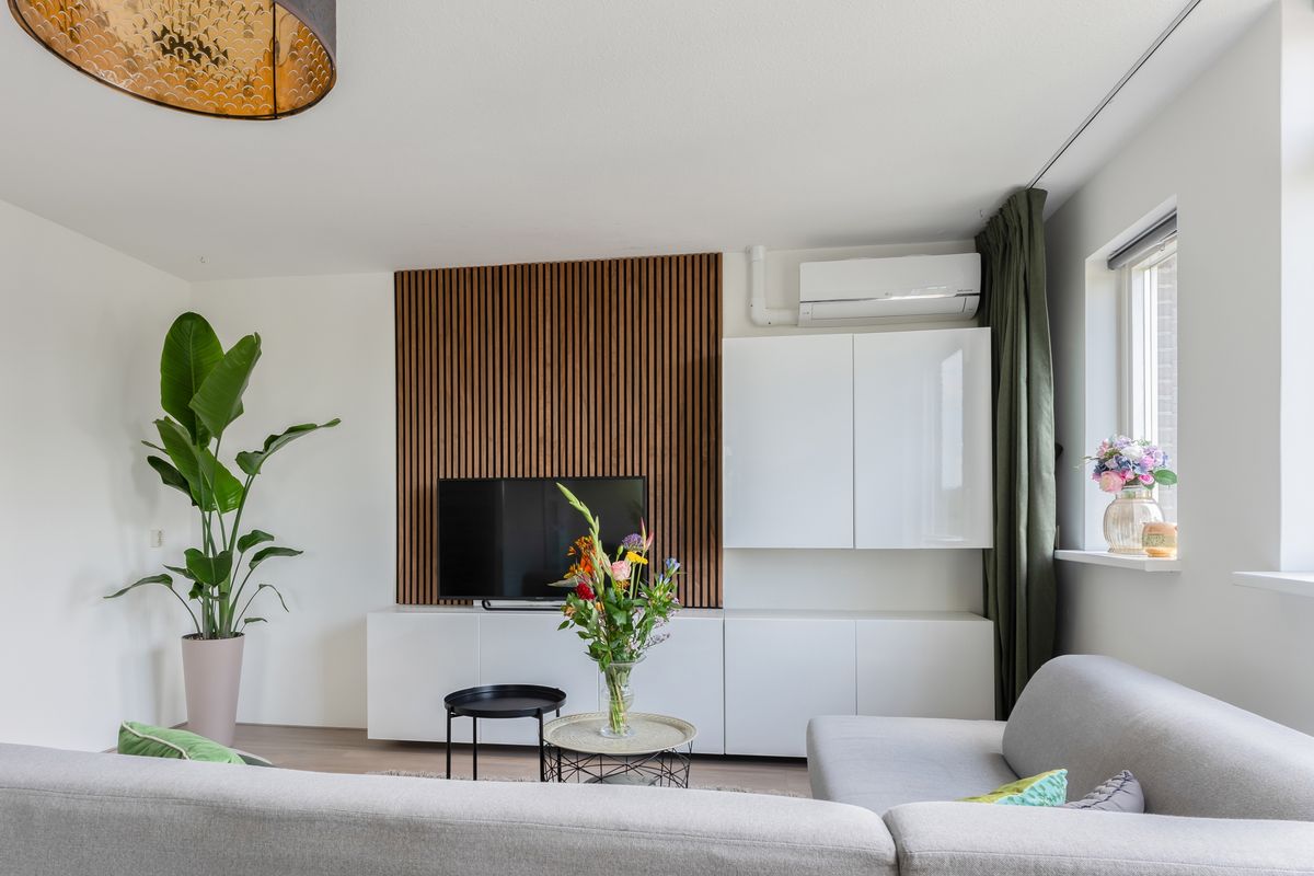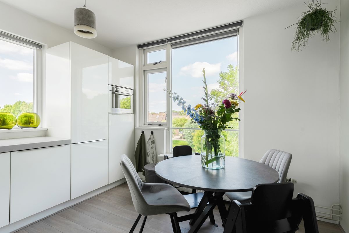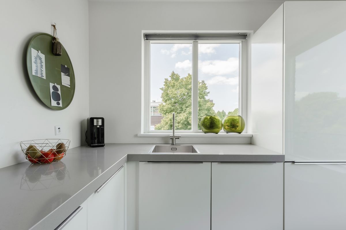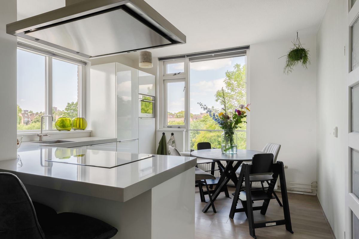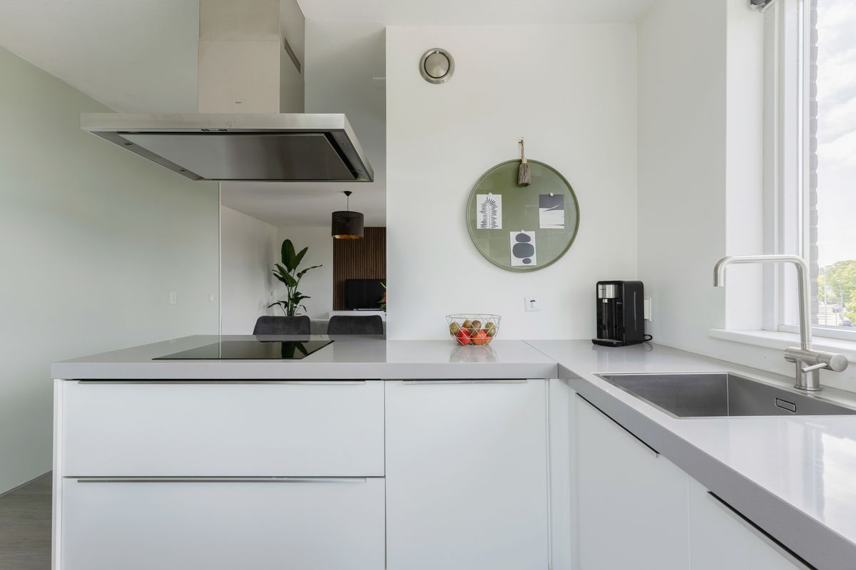 De stijlvolle keuken (2017) bevindt zich aan de voorzijde en is uitgevoerd in een praktische L-opstelling. Je beschikt over diverse inbouwapparatuur, waaronder een vaatwasser, inductiekookplaat, afzuigkap, combi-oven, koel-vriescombinatie en een luxe mengkraan. Het strakke composieten werkblad en de ruime kastopstelling maken het geheel compleet.