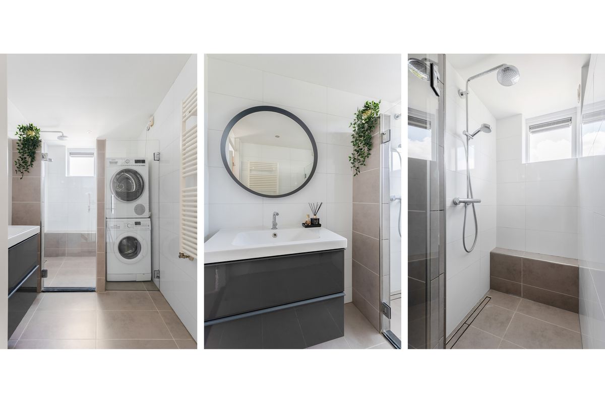 De moderne badkamer is stijlvol afgewerkt en voorzien van de aansluitingen voor wasmachine en droger. Ook bevindt zich op deze verdieping een handige bergkast en heb je vanaf de overloop toegang tot een tweede, zonnig balkon.