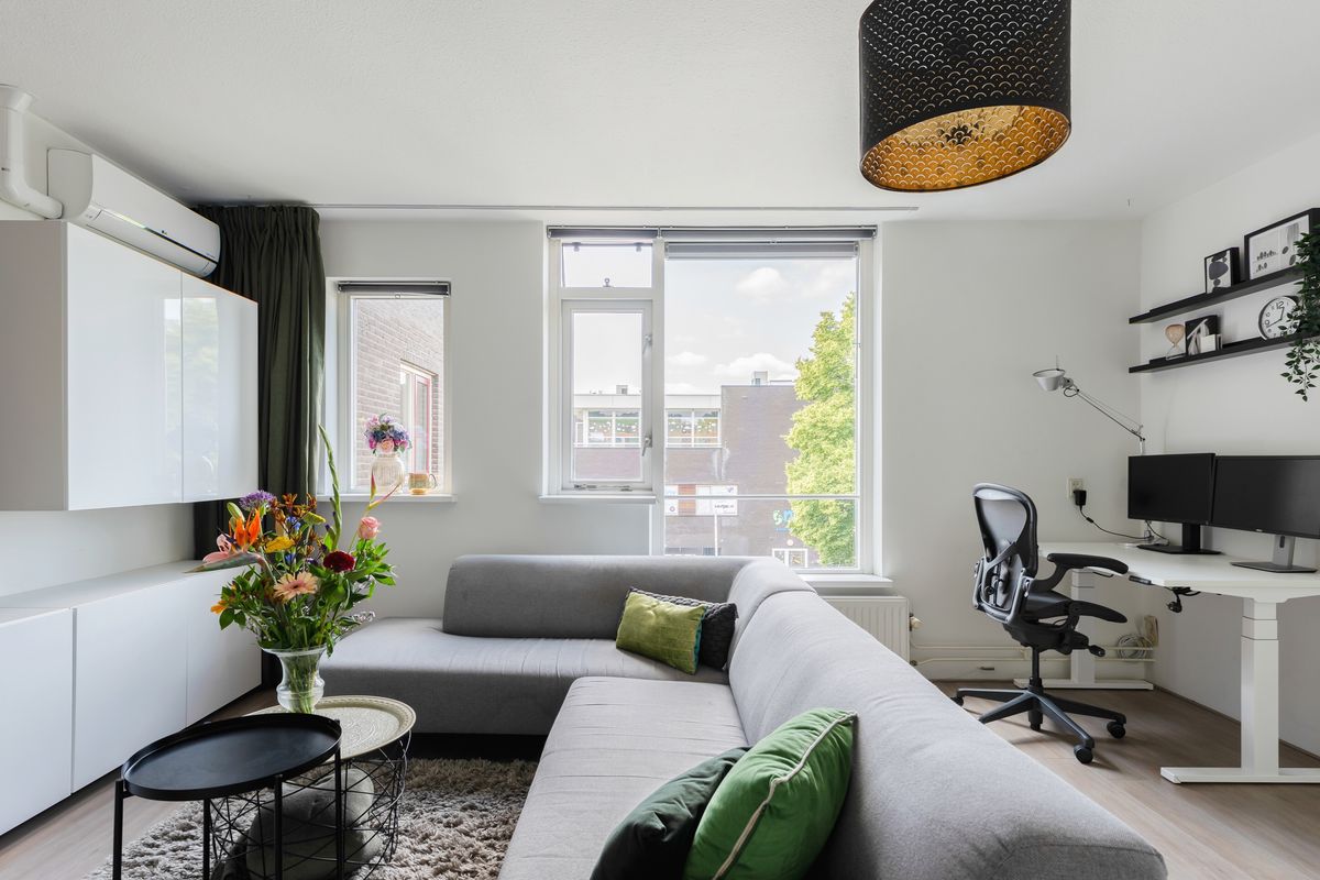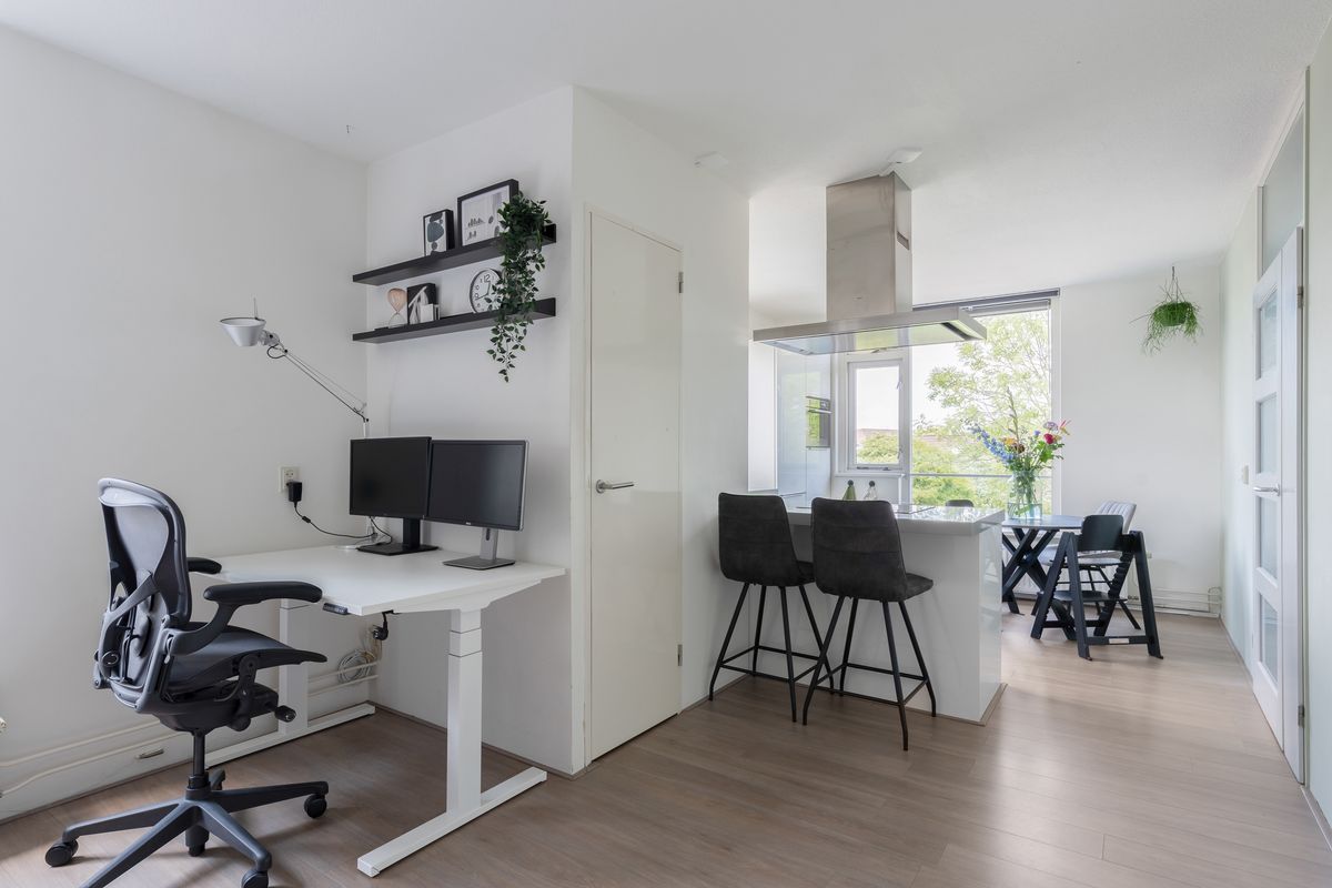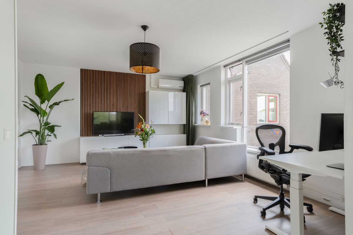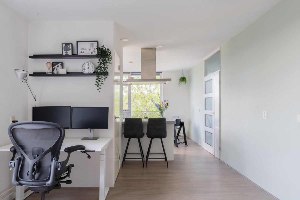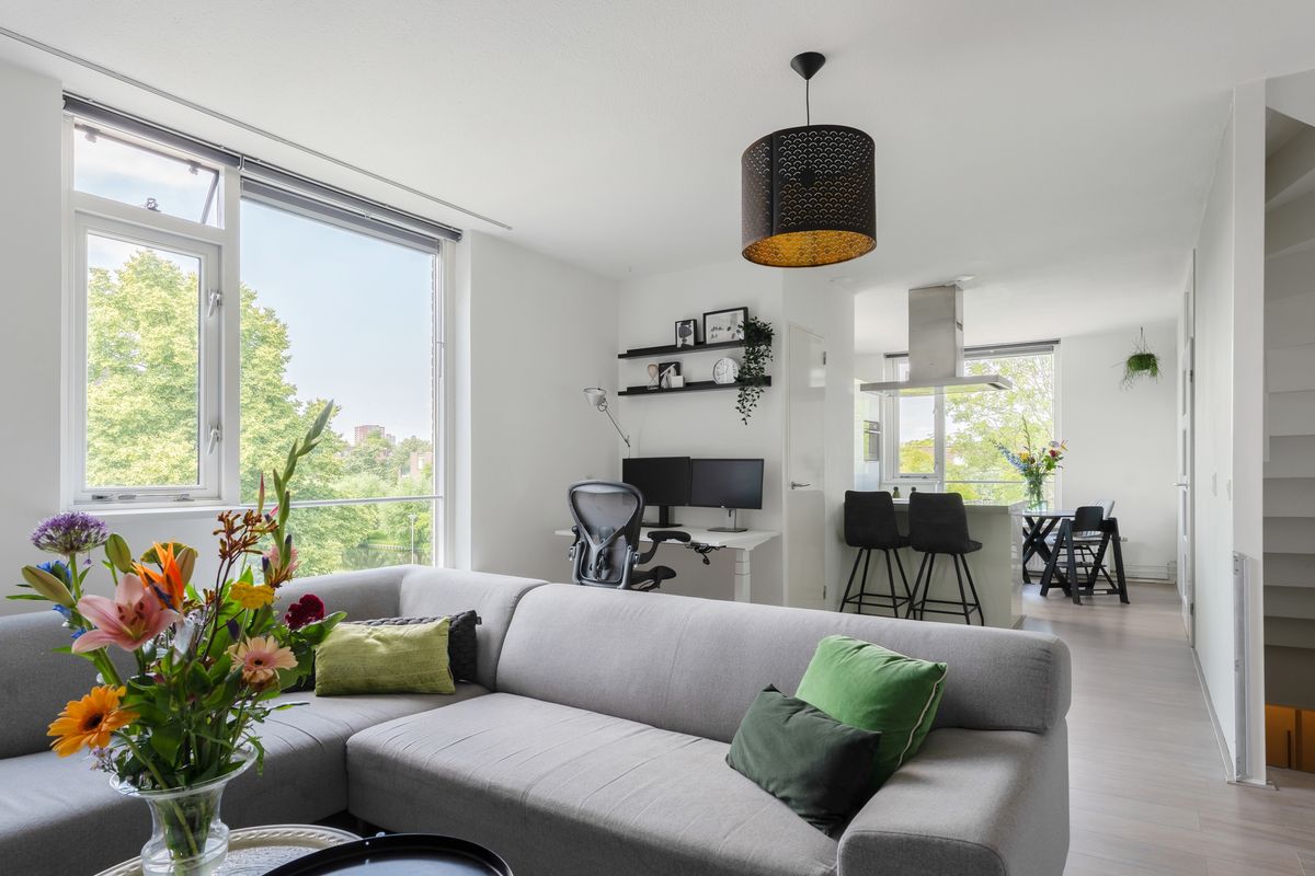 Via de overloop, waar zich tevens het toilet en de vaste trapopgang naar de derde verdieping bevinden, bereik je de royale woonkamer en de keuken. De woonkamer ligt aan de achterzijde van de woning en is dankzij de grote raampartijen opvallend licht en ruimtelijk. De wanden zijn strak gestuukt en de verdieping is afgewerkt met een nette laminaatvloer.