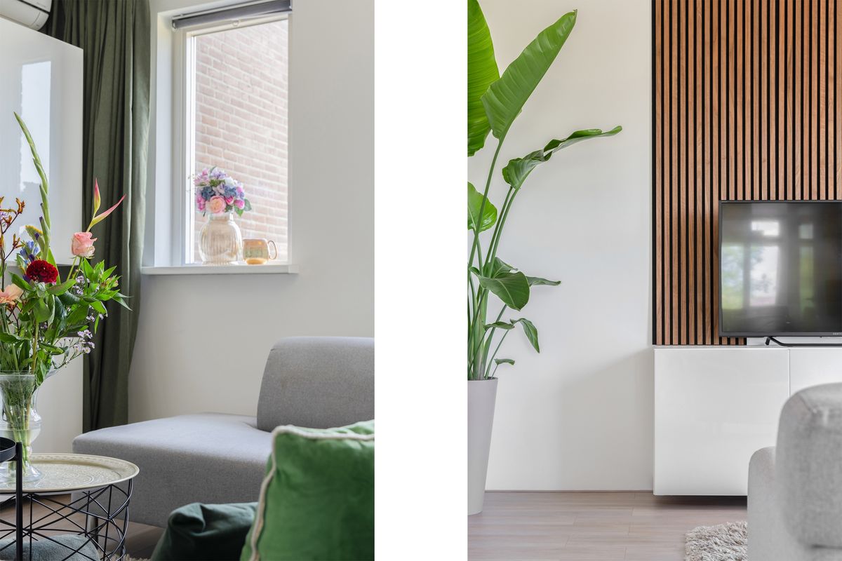 From the landing—where you will also find the toilet and the staircase to the third floor—you enter the spacious living room and kitchen. The living room is situated at the rear of the property and, thanks to its large windows, offers an abundance of natural light and a wonderfully airy atmosphere. The walls are smoothly finished, and the floor is laid with a neat laminate.