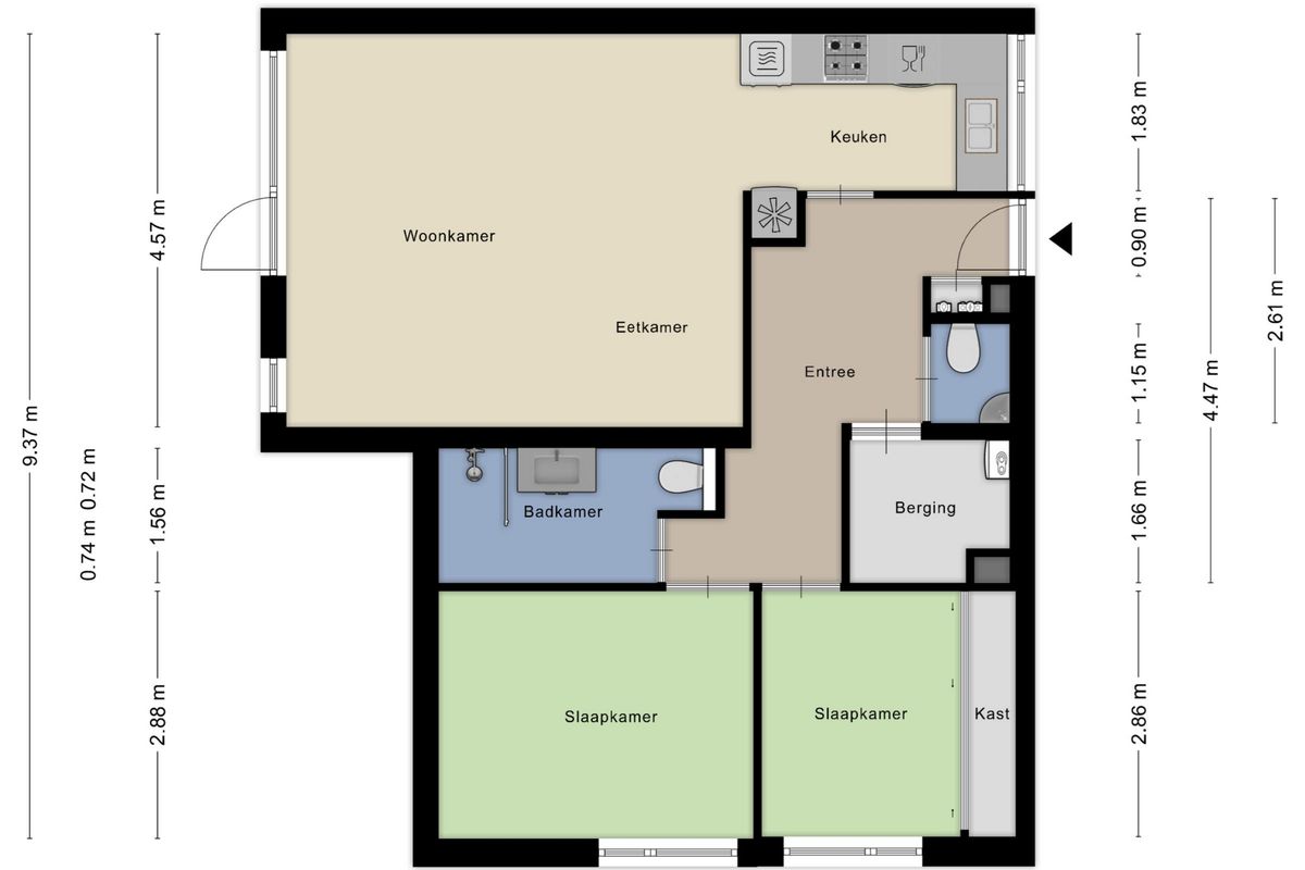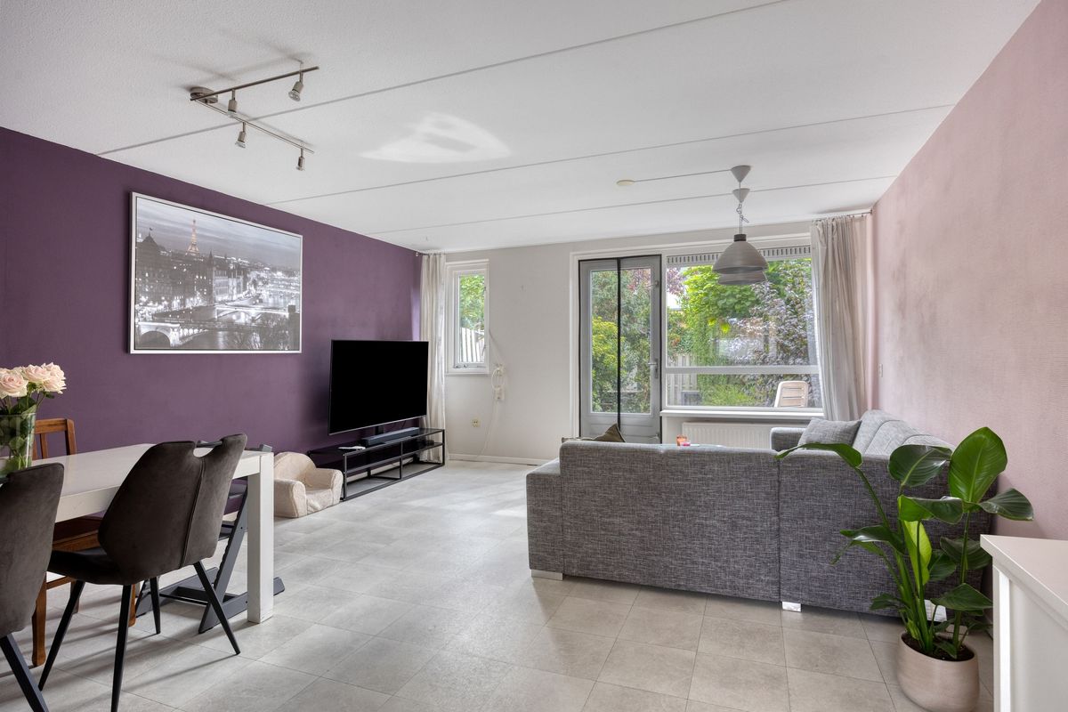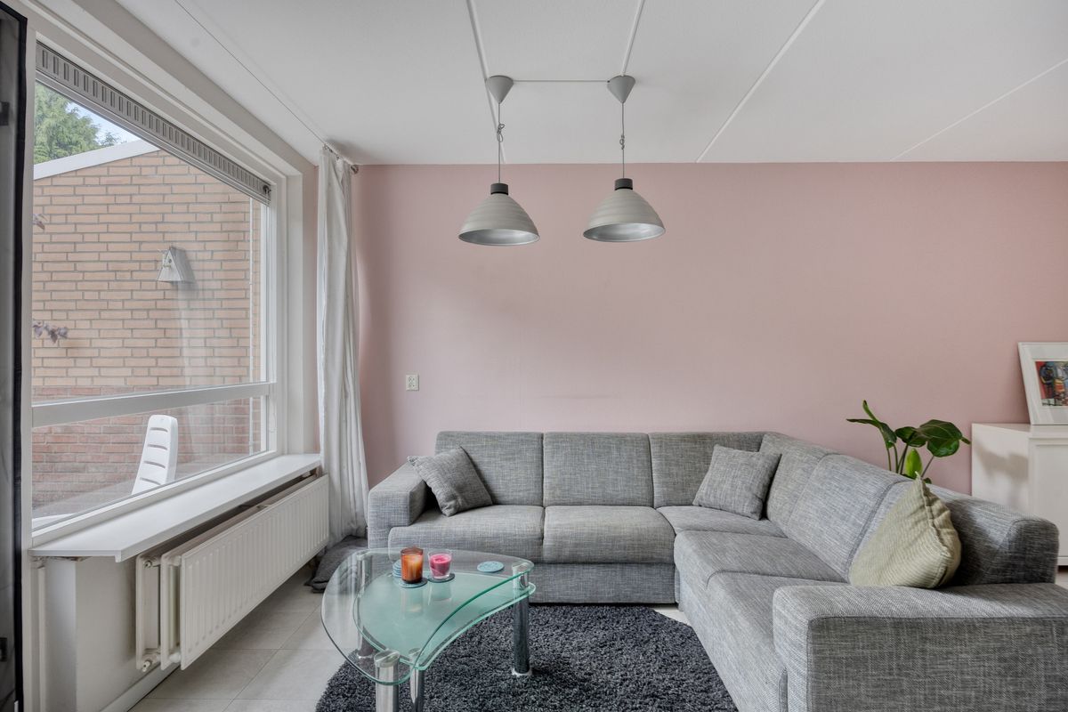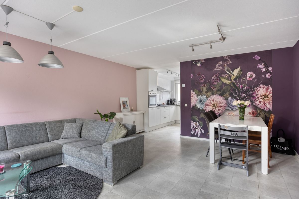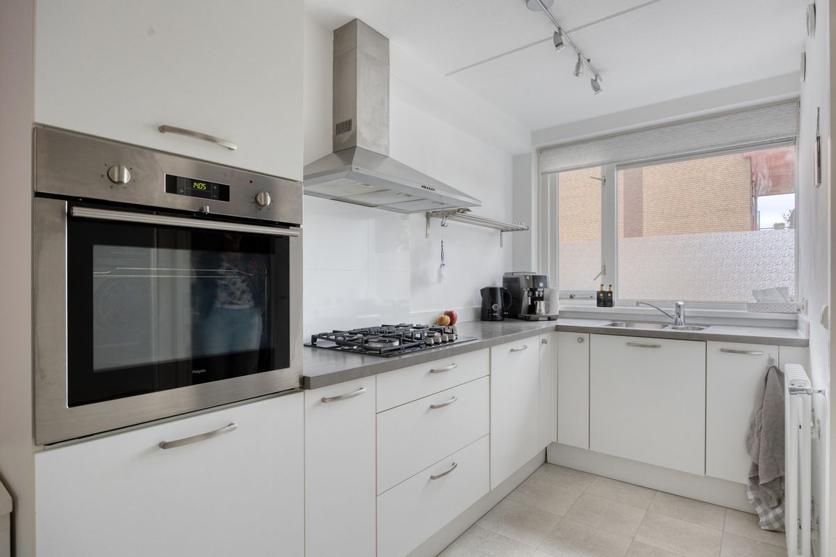 De woonkamer is gelegen aan de achterzijde en is tuingericht. Er is een prettige lichtinval door de raampartij aan de achterzijde. Aan de voorzijde ligt de lichte open keuken met een L-opstelling en is voorzien van diverse inbouwapparatuur: 4-pitsgaskookplaat, afzuigkap, magnetron, vaatwasser en een losse koel-vriescombinatie.