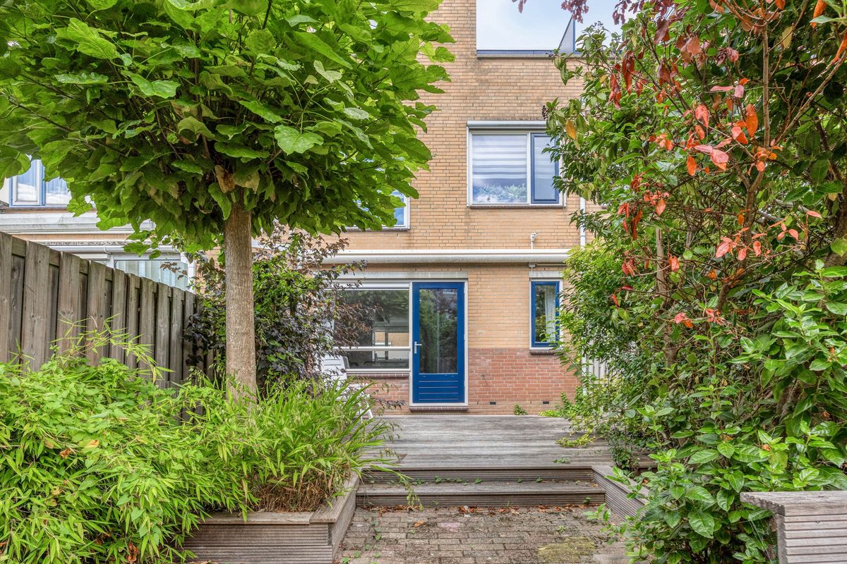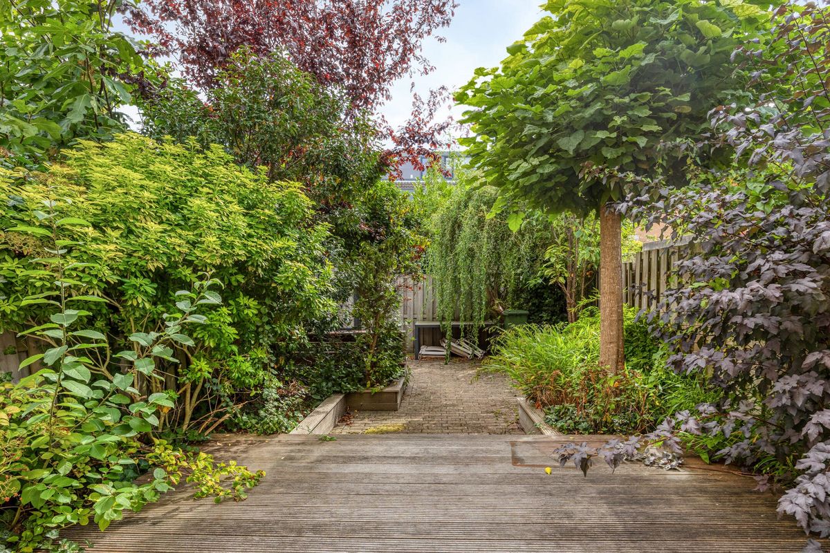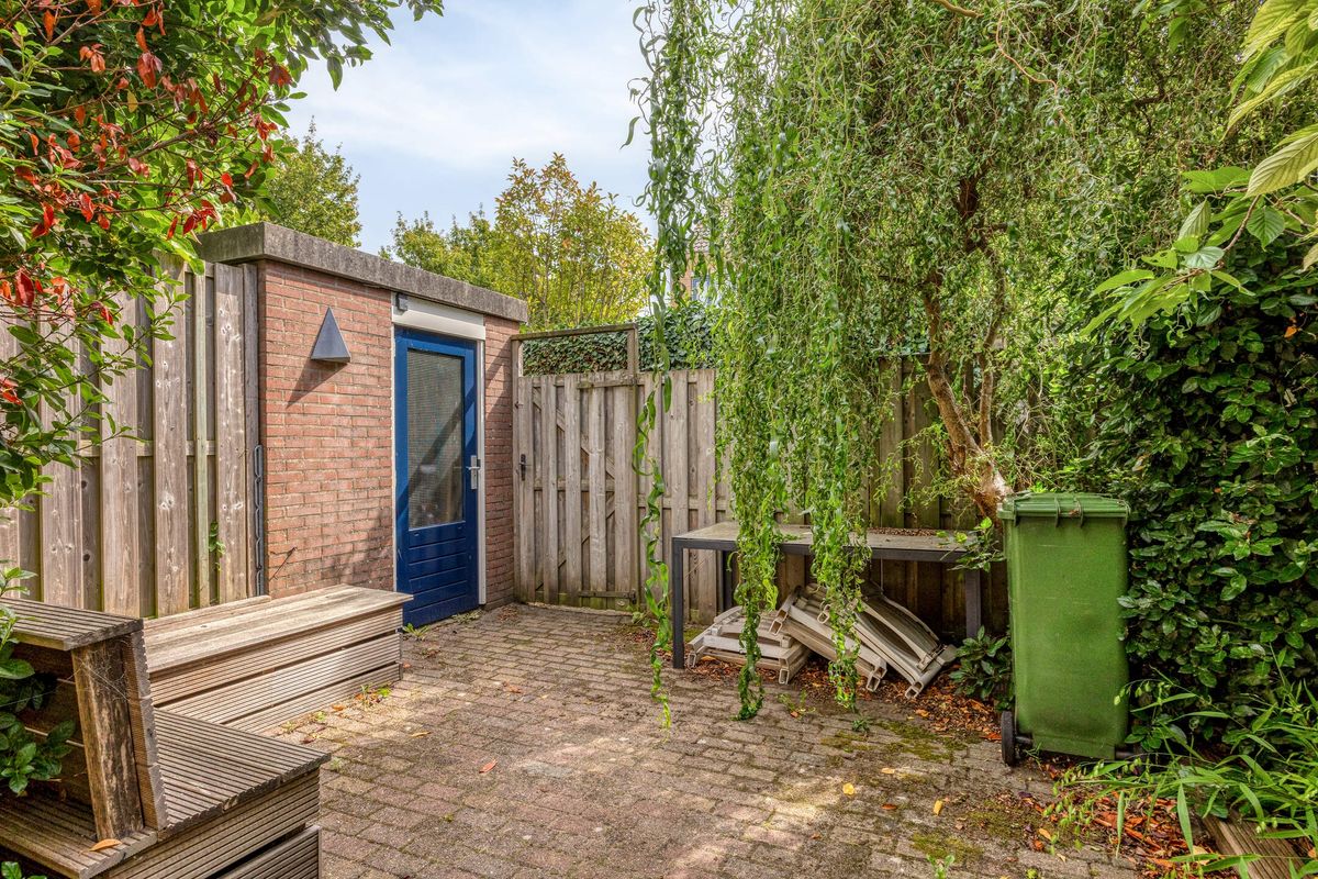 Via een loopdeur is de diepe achtertuin bereikbaar. Deze is gelegen op het zuidoosten, zodat u hier heerlijk kunt genieten van de zon. Aan de achterzijde van de tuin staat een vrijstaande stenen berging en is er een achterom naar de achterliggende poort. De achterzijde van de woning is voorzien van een zonwering.