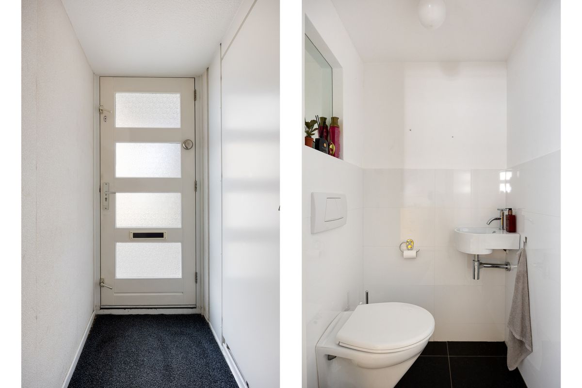 Na de entree volgt een ruime hal met toiletruimte met modern toilet en fonteintje, een meterkast en een inpandige berging met opstelplaats HR-combiketel (Vaillant Ecofit 2025), mechanische ventilatie unit en een wasmachine-aansluiting. Via de hal is er toegang tot alle vertrekken in de woning.
