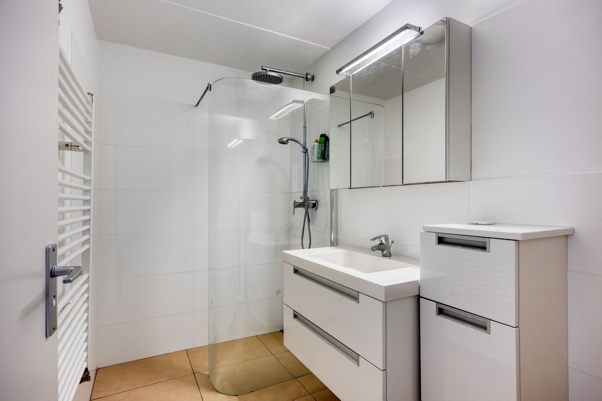 De badkamer is gedeeltelijk betegeld en voorzien van een inloopdouche met glazen wand en regendouche, wastafelmeubel met spiegelkast, ladekast, handdoekradiator en een tweede toilet.
