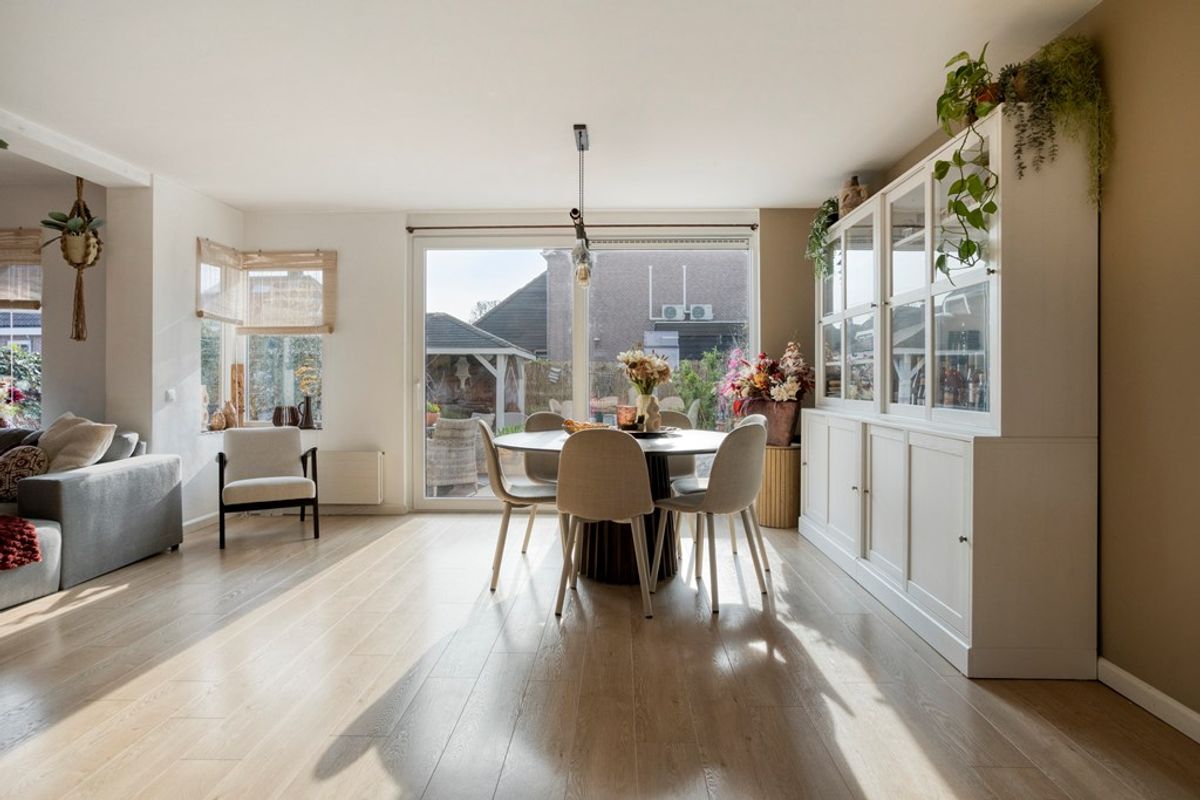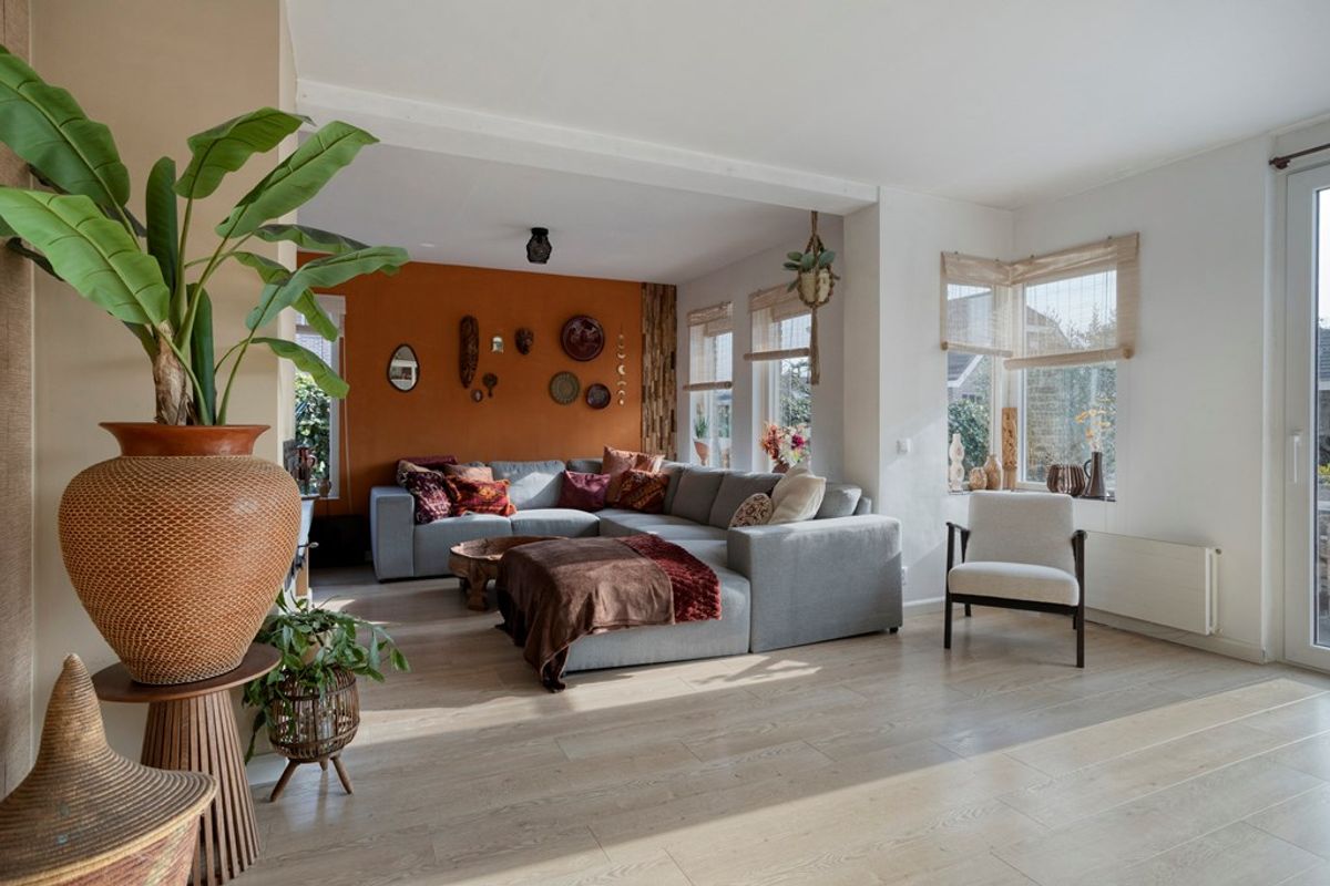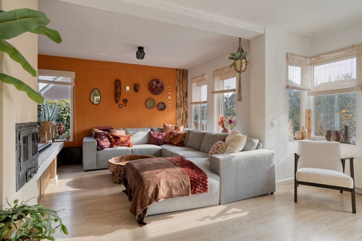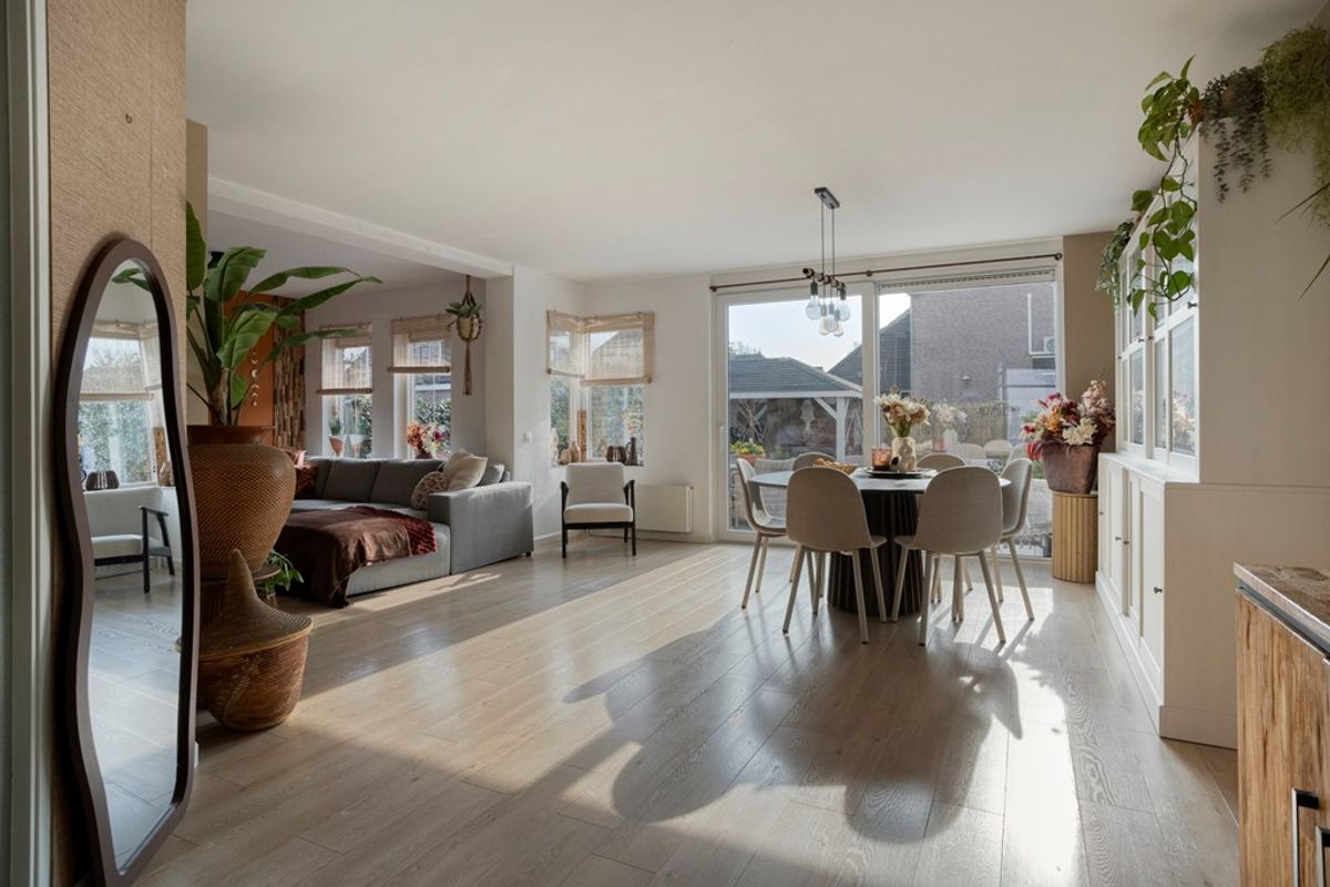 Vanuit de hal komt u in de ruime lichte woonkamer waar u direct zicht heeft op de achtertuin door de grote glazen schuifpui. De kamer is voorzien van nette wanden en plafonds en beschikt net de rest van de benedenverdieping over vloerverwarming. Voor extra sfeer en warmte kunt u gebruik maken van de sfeervolle houtkachel. De half open keuken vindt u aan de voorzijde. Deze is uitgevoerd in een klassiek landelijke stijl met veel werkruimte op het fraaie keukenblad, veel bergruimte en ingericht met diverse moderne apparatuur. Extra bergruimte vindt u in de grote inpandige garage welke vanuit de gang te bereiken is.