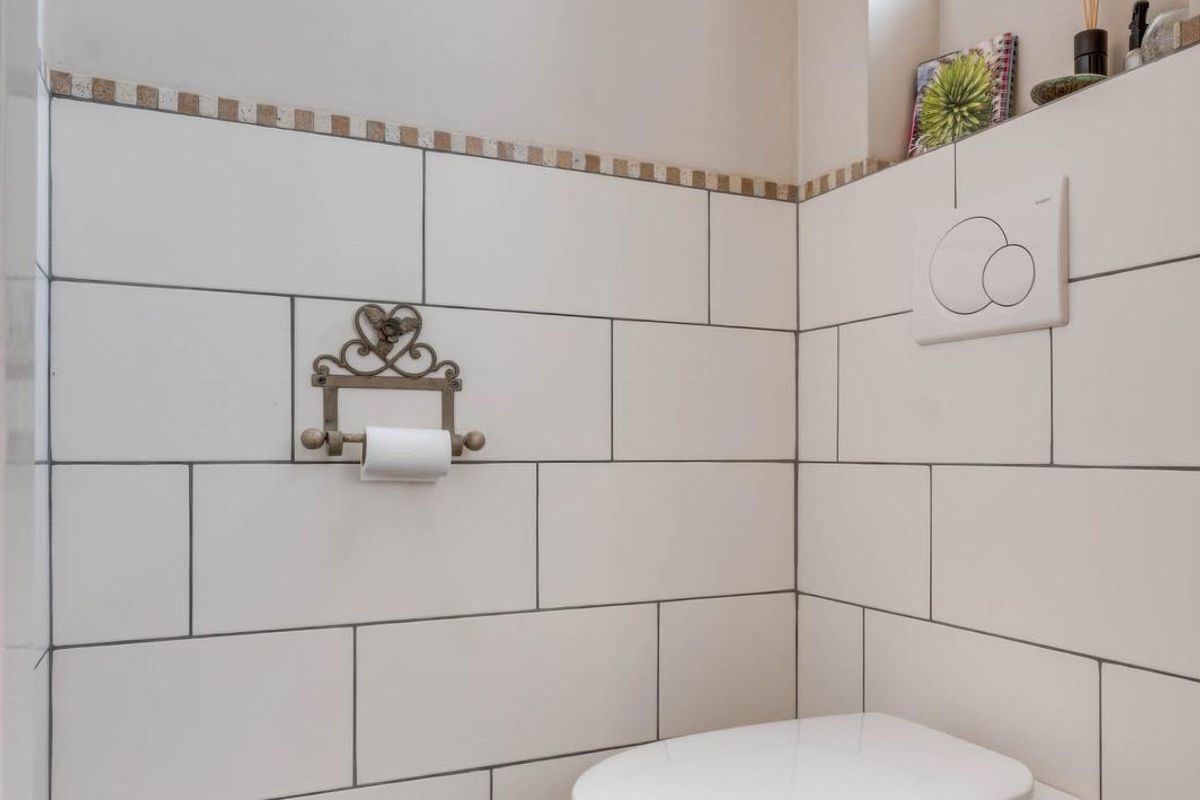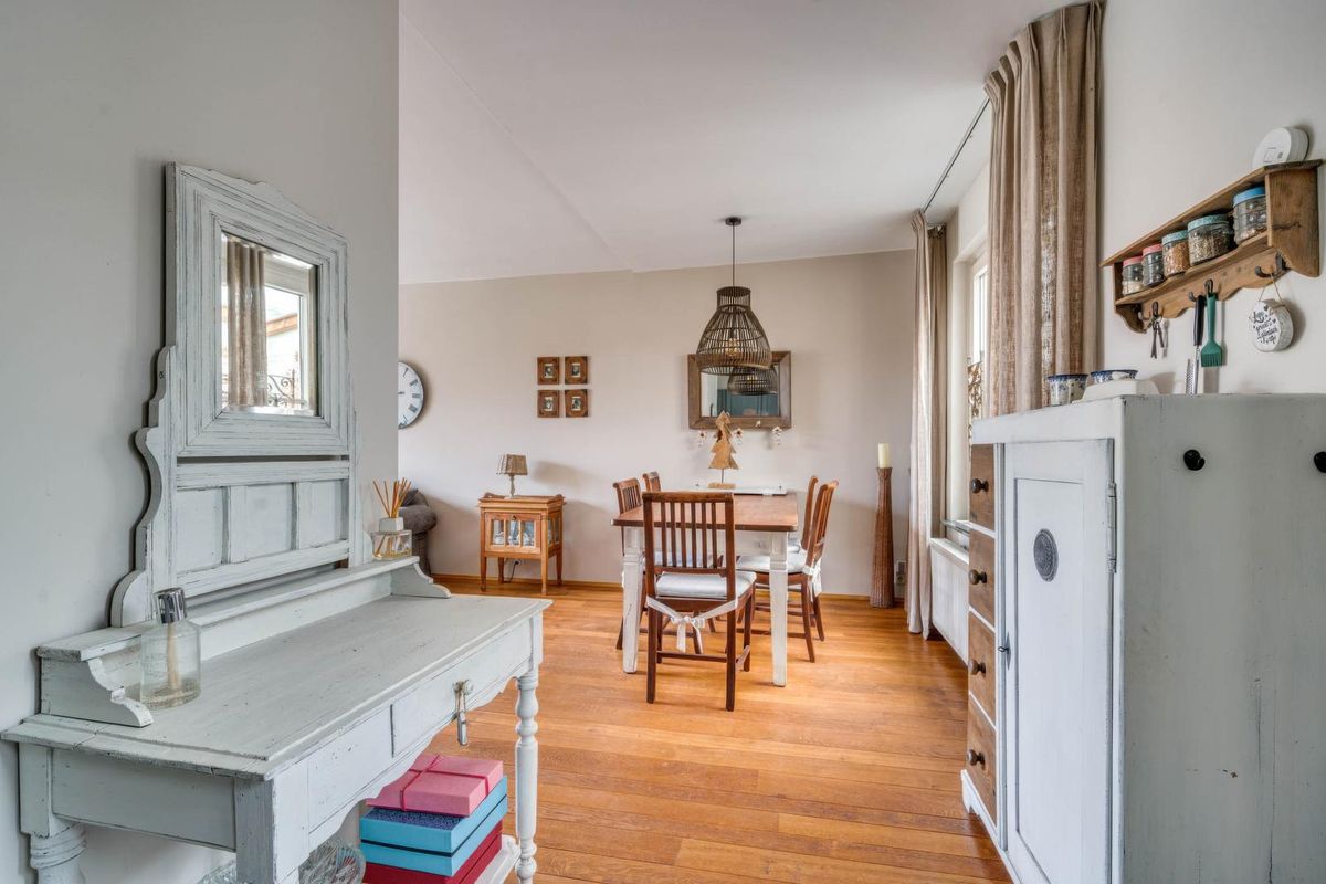 De deels betegelde toiletruimte is voorzien van een zwevend toilet en buitenraam. De keuken is voorzien van een tegelvloer en beschikt over elektrische kookplaat, oven, spoelbak, afzuigkap, koelkast en een loopdeur naar de tuin. De woonkamer is voorzien van een houten vloer en beschikt over een zit en eetgedeelte.