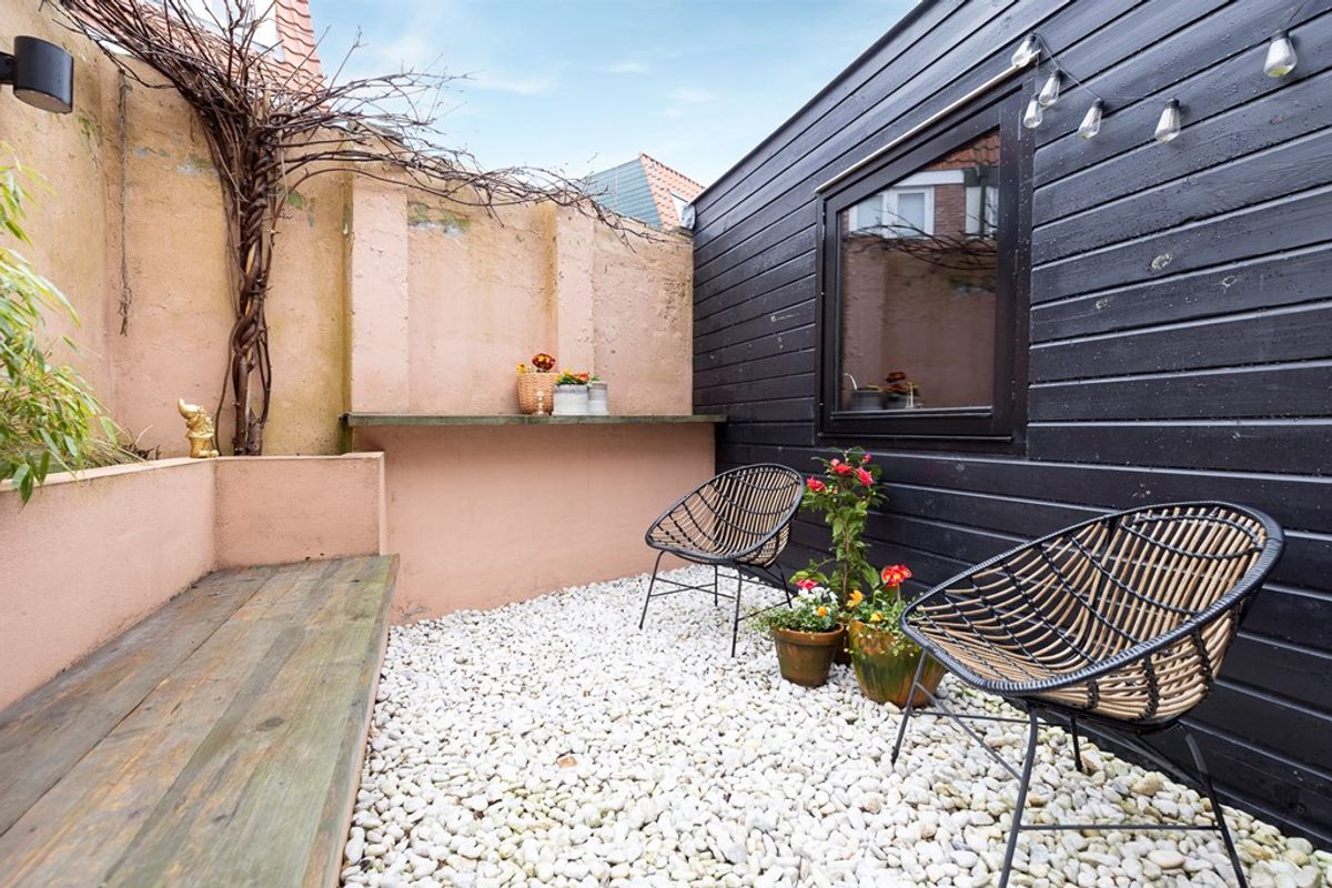 Binnenkomst is in de leuke woonkeuken. De keuken bestaat uit een kookeiland met gezellige bar functie en een keukenwand met alle nodige apparatuur. Verder is de keuken afgewerkt met mat zwarte fronten, strakke grepen en een betonnen werkblad en dit geeft het geheel een moderne, tijdloze uitstraling. In de keuken krijg je tevens toegang tot een halletje die toegang geeft tot het toilet. Vanuit de keuken loop je door naar de woonkamer en hier vind je voldoende plaats voor het creëren van een comfortabele zithoek. Het hele huis is zeer fraai afgewerkt met een prachtige laminaatvloer, strak gestuukte wanden en een strak gestuukt plafond, waardoor er een sfeervolle fijn thuis is ontstaan. In zowel de keuken als de woonkamer zijn in het plafond inbouwspots verwerkt, die zorgen voor een mooie manier van verlichten. Grenzend aan de woonkamer bevindt zich de eerste slaapkamer met lichtkoepel en openslaande deuren naar de tuin. Het zal je waarschijnlijk niet verbazen, maar ook deze ruimte is weer tip top afgewerkt. 's Morgens even rustig wakker worden in de tuin onder het genot van het een kop koffie, terwijl de slaapkamer zich vult met een frisse buitenbries. De badkamer is eveneens keurig en modern en is met een dubbel wastafelmeubel met opbergruimte en een inloopdouche helemaal compleet te noemen. Vanuit de badkamer krijg je tevens toegang tot de tweede slaapkamer. In deze slaapkamer tref je tevens een bergkast met de cv-opstelling en de aansluiting voor de wasapparatuur. Deze tweede slaapkamer is eventueel als kantoor te gebruiken, inloopkast of als kinderkamer zoals het nu wordt gebruikt.