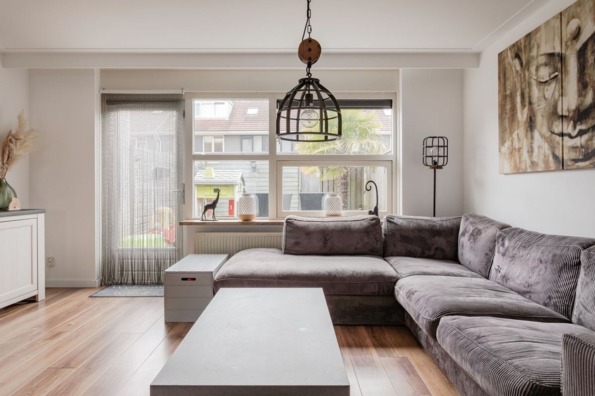 Een roededeur met facet geslepen glas geeft toegang tot de tuingerichte living met gestuukte wanden en dito plafond met een platte plint. Op de vloer ligt laminaat wat is doorgelegd vanuit de hal en ook in de diepe en praktische trapkast is het laminaat doorgelegd. Er kan fijn worden geventileerd d.m.v. het uitzetraam aan de tuinzijde en een tuindeur geeft toegang tot de zonnig gelegen tuin.