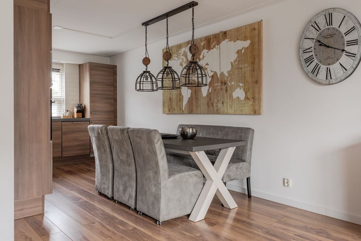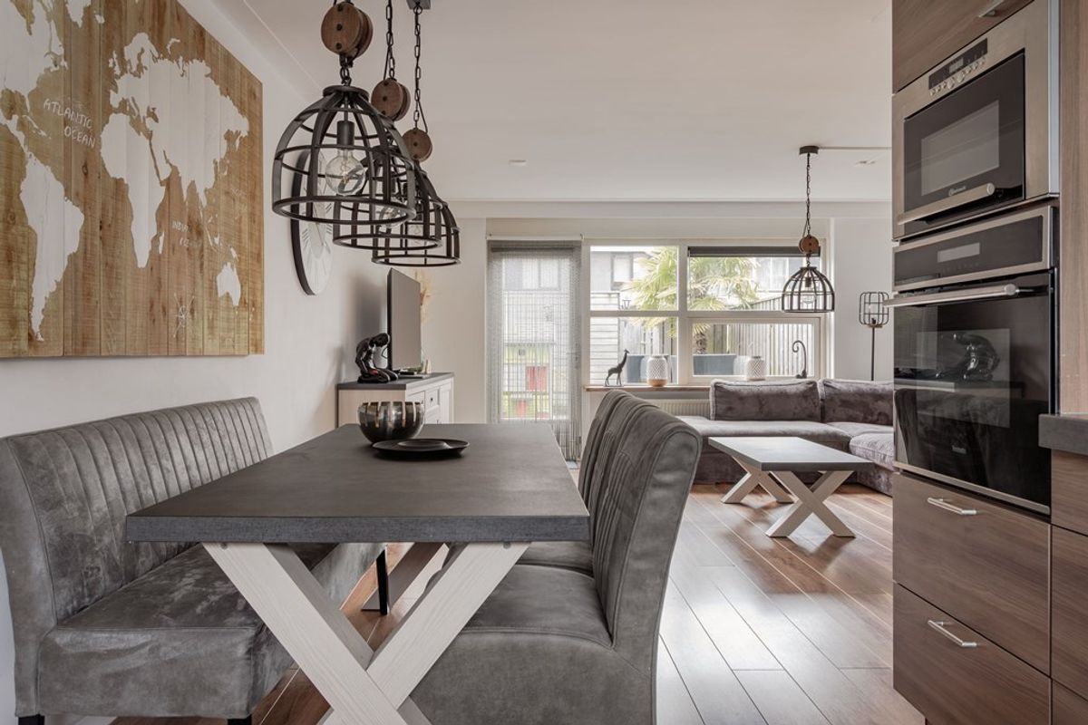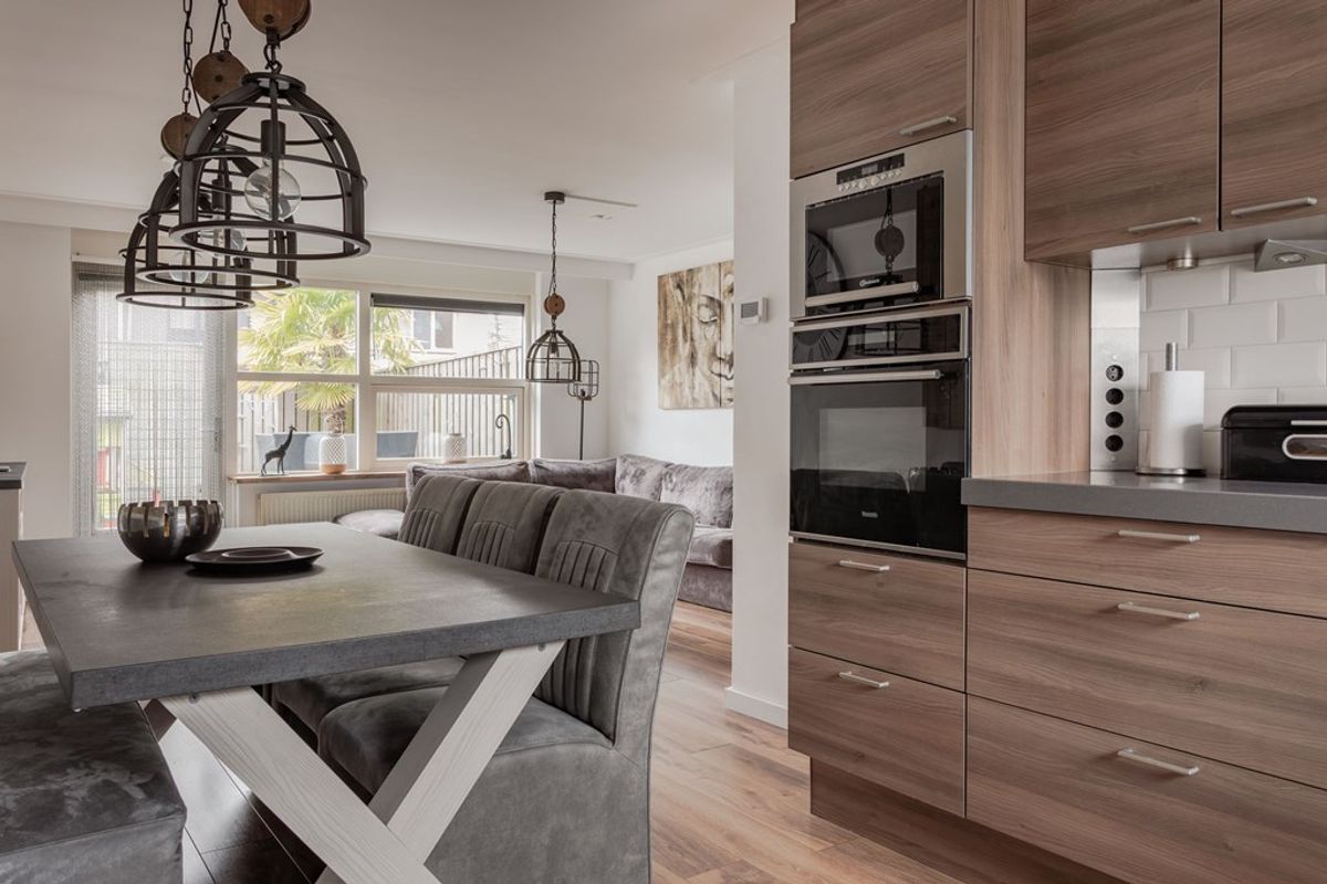 Ruime keukenopstelling met verhoogd werkblad uitgevoerd in composiet en veel werkruimte. Vanwege de grote raampartij met ventilatierooster en een uitzetraam heeft u prettig lichtinval op het werkblad. De keuken met enorm veel bergruimte in de soft-close laden, kastjes, carrouselkast en bovenkastjes met bladverlichting voorziet in diverse inbouwapparatuur, zoals: een grote oven, separate magnetron, koel-vriescombinatie, vaatwasser, 5 pits gaskomfoor, afzuigkap met de afvoer naar buiten en een kick-space. Opvallend zijn de vele stopcontacten waar je er nooit genoeg van kan hebben in een keuken en de achterwand is betegeld met lichte metrotegeltjes.