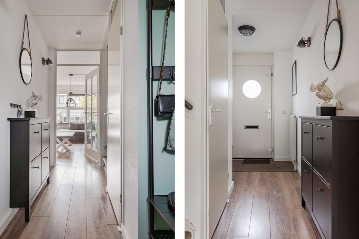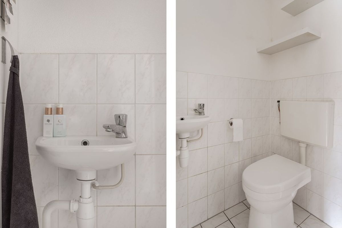 Geheel bestrate voortuin met gemetseld muurtje en buitenkraan. Ook een hele fijne plek om te zitten in het avondzonnetje. Achter de voordeur ligt de hal met gestuukte wanden en een laminaatvloer, de trapopgang en het toilet met deels licht betegelde wanden en vloer, staand toilet, fonteintje en centraal afzuigsysteem.
