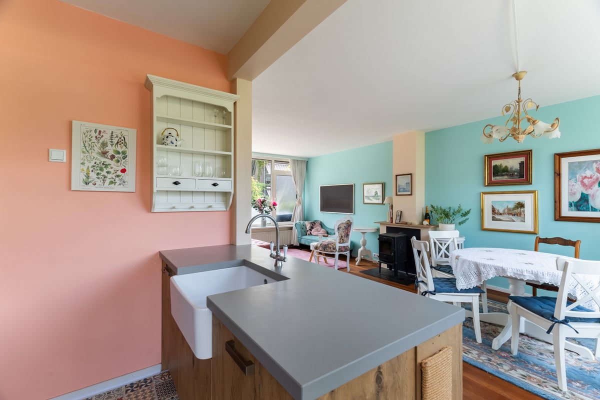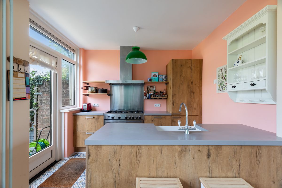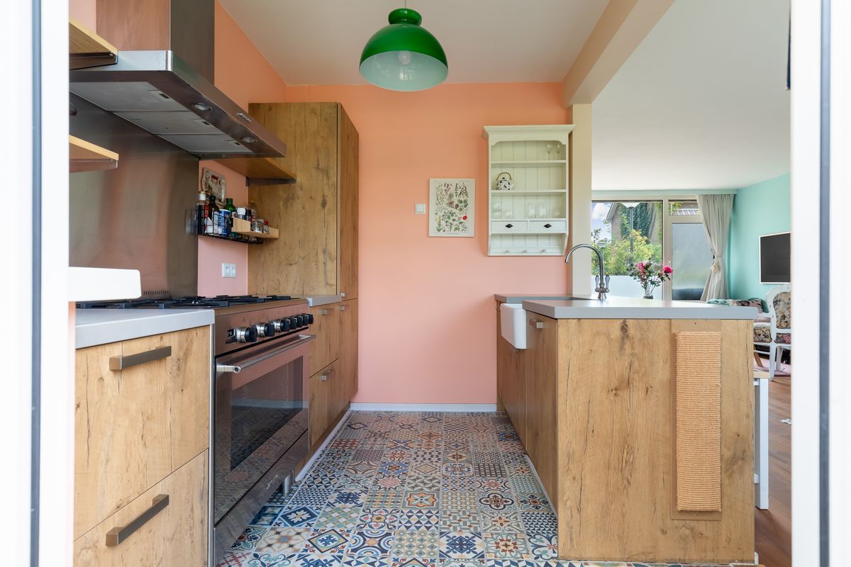 Keuken (2.76 x 2.24m) De open keuken is vernieuwd en gesitueerd aan de achterzijde van de woning. Deze mooie keukeninrichting is geplaatst in een parallel opstelling, waarvan één deel een spoelschiereiland betreft en het andere deel o.a. een groot oven-fornuis huisvest van het topmerk Smeg. De keuken is voorzien van diverse inbouwapparatuur en op de grond liggen sfeervolle mediterrane tegels. Via een enkele (kunststof) deur kunt u vanuit de keuken de achtertuin bereiken. Deze is gunstig gelegen op het noordwesten.