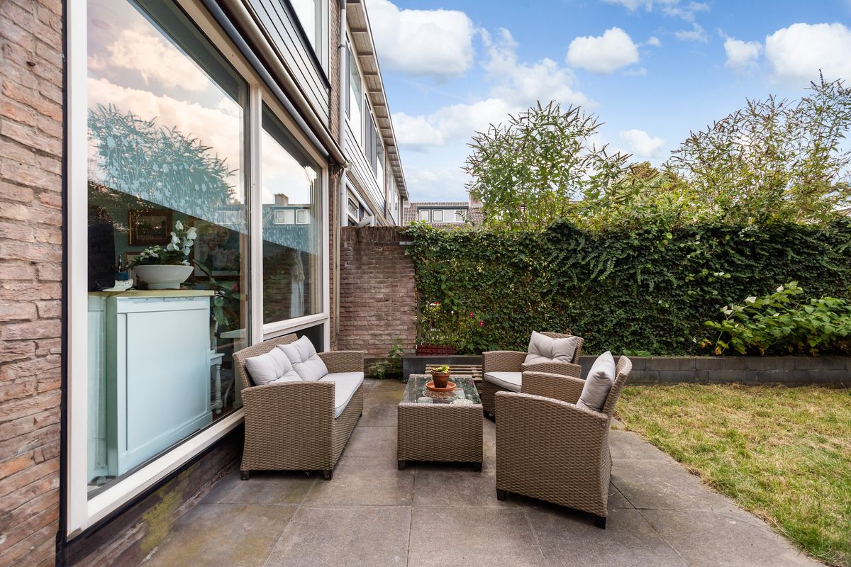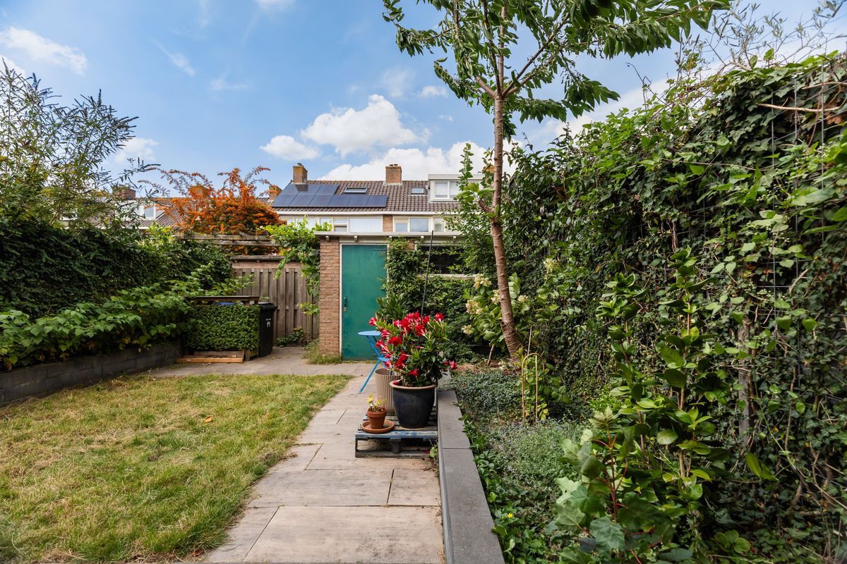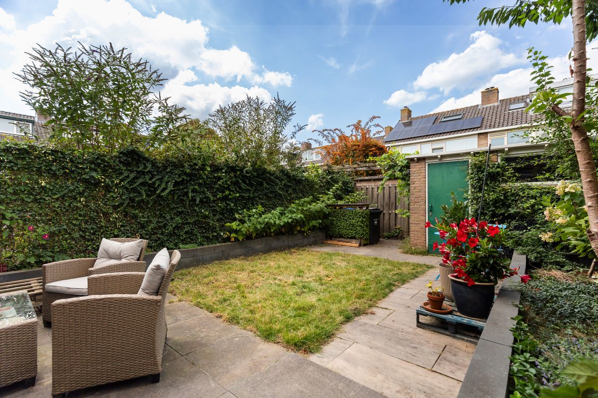 Achtertuin (11.24 x 6.60m) De achtertuin is gelegen op het zonnige noordwesten en is voorzien van plantenborders, een achterom, zonnescherm (elektrisch bedienbaar), waterkraan en een berging.