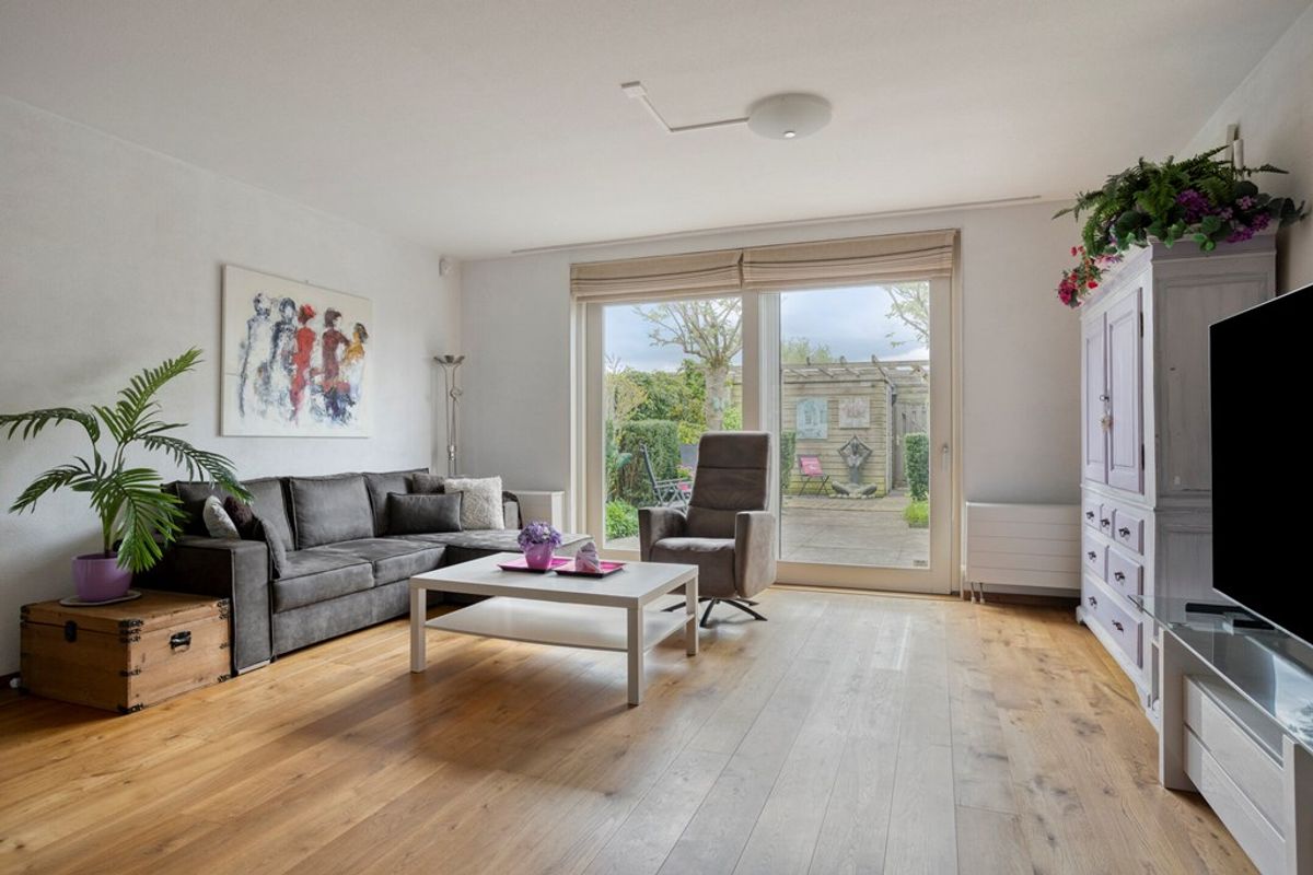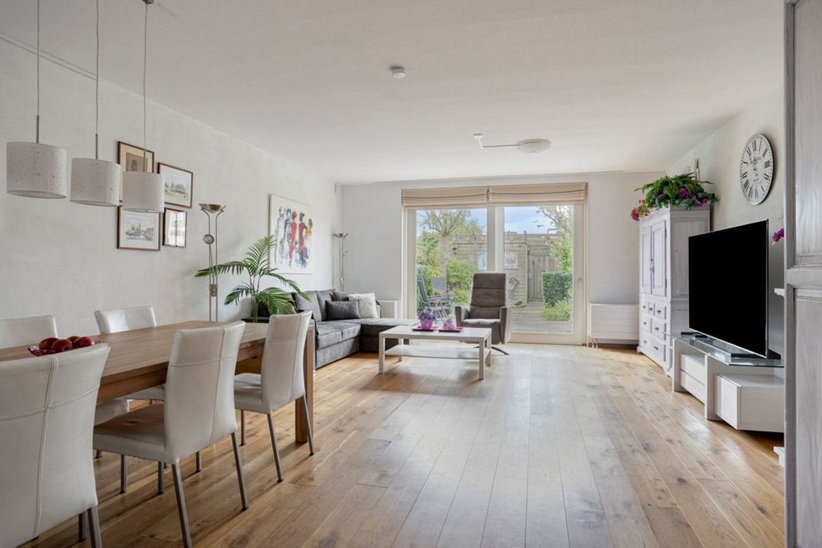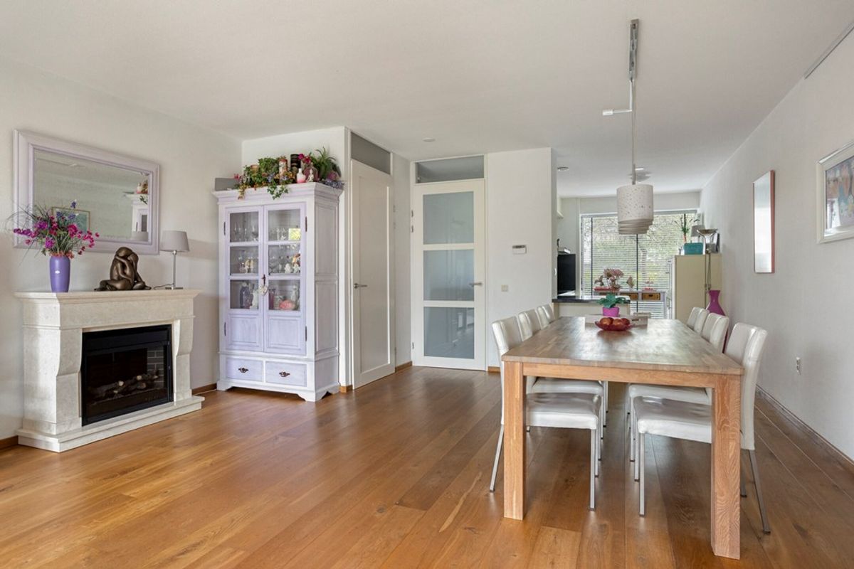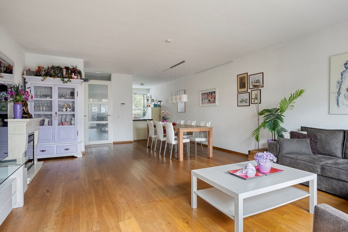 De woning is netjes afgewerkt en voorzien van een doorlopende houten vloer op de begane grond, een lichte woonkamer en een halfopen keuken met inbouwapparatuur.
