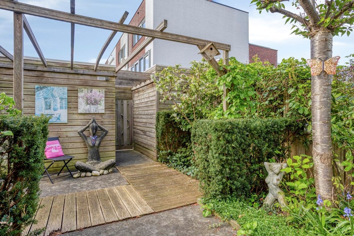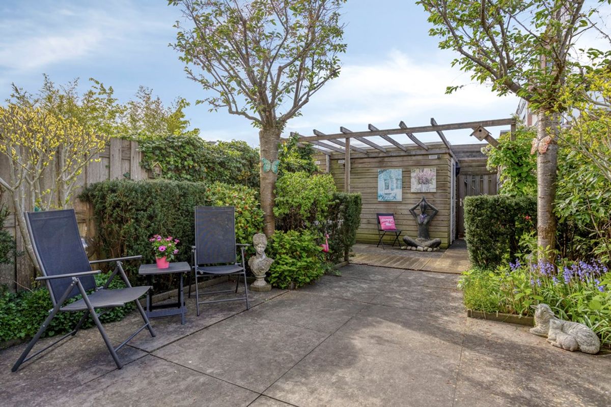 Aan de achterzijde bevindt zich de achtertuin op het zuiden, waar je de hele dag kunt genieten van de zon. Aan de voorzijde beschikt de woning over een verzorgde voortuin, perfect als extra zitplek of groene entree.