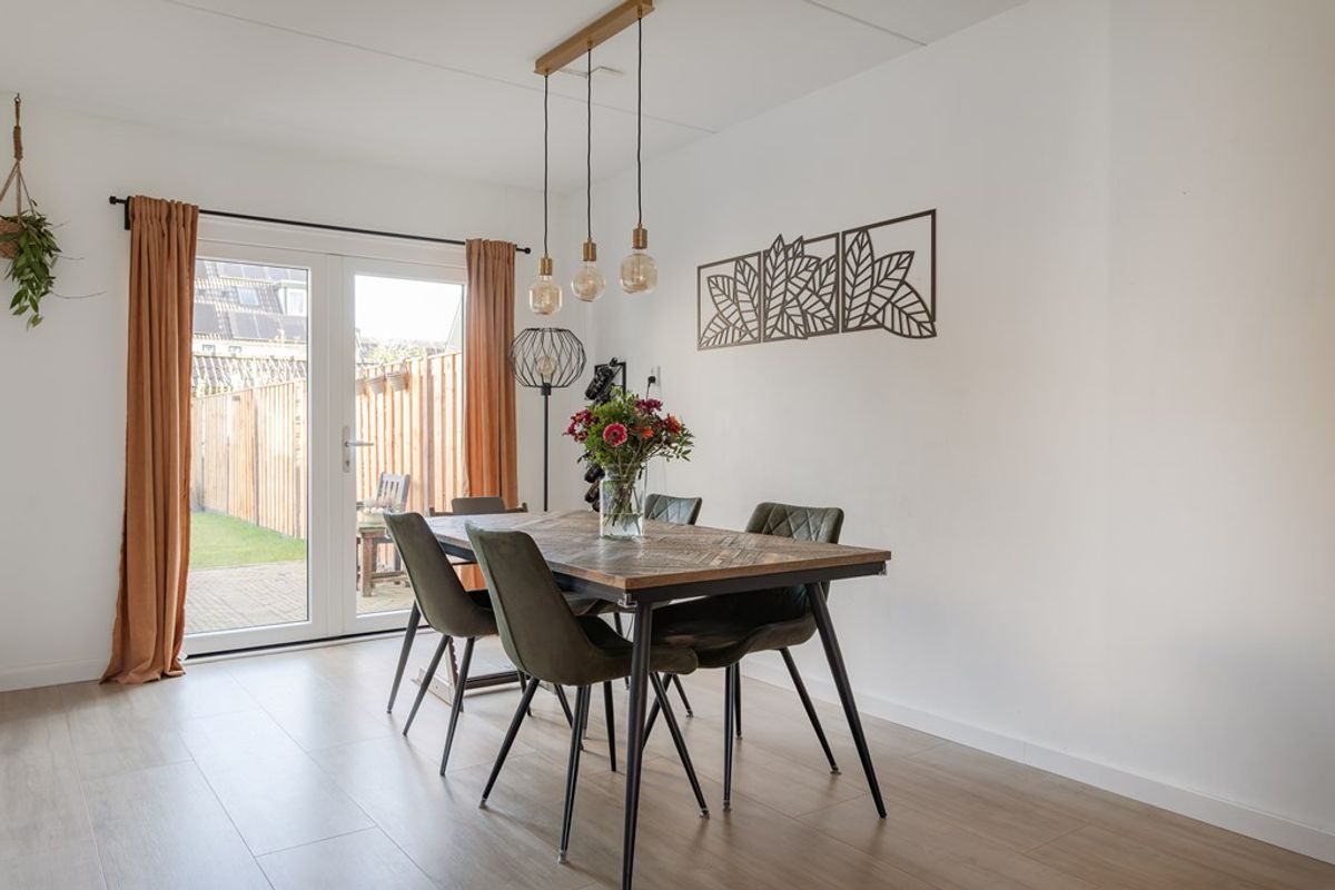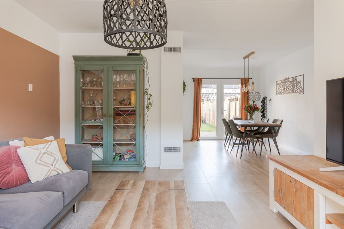 De sfeervolle en trendy living heeft strak gestuukte wanden, op de vloer is een laminaat met brede vloerdelen gelegd en in 2023 zijn de kunststof kozijnen met HR++ glas en ventilatieroosters geplaatst. De ruimte wordt verwarmd door de heteluchtverwarming, dus geen stoffige radiatoren. Bij de eethoek naast de halfopen keuken zijn in 2023 ook kunststof openslaande deuren geplaatst met HR++ glas. Echt een fijne woonruimte voor uzelf, een gezin en om vrienden en kennissen te ontvangen.