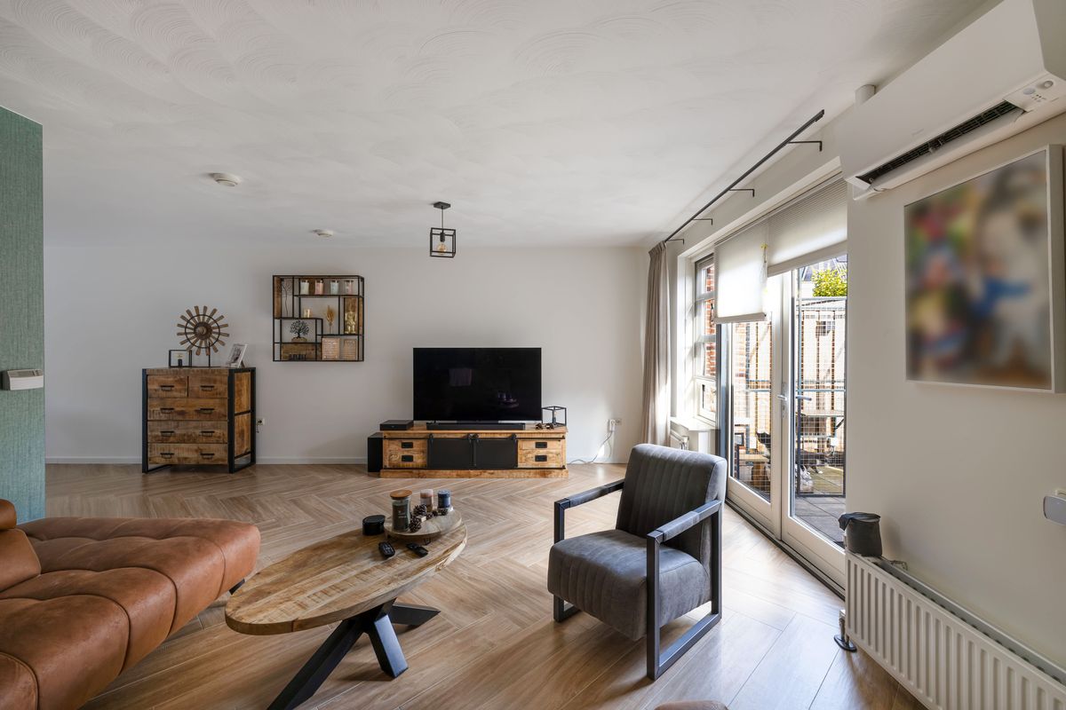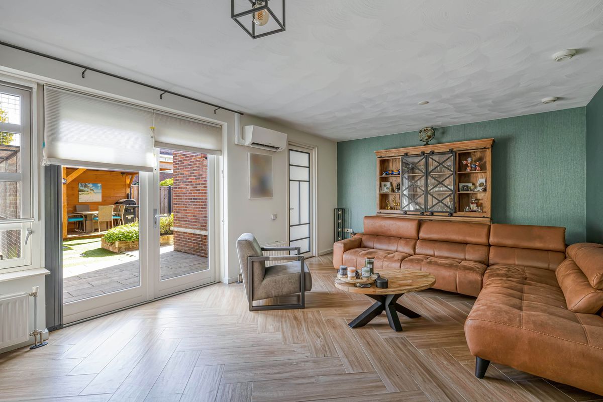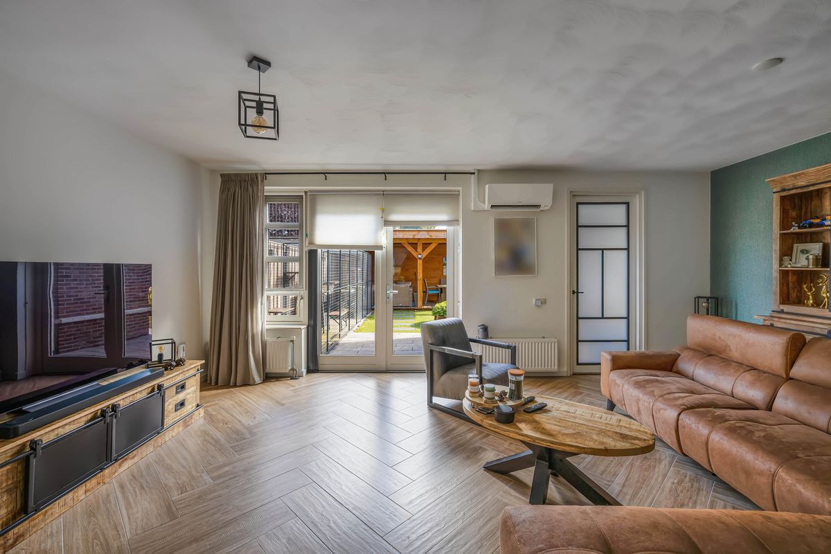 Boven het terras hangt een zonnescherm, zodat je op warme dagen ook in de schaduw kunt genieten. Via de openslaande deuren in de woonkamer stap je direct het terras op, waardoor binnen en buiten moeiteloos in elkaar overlopen.