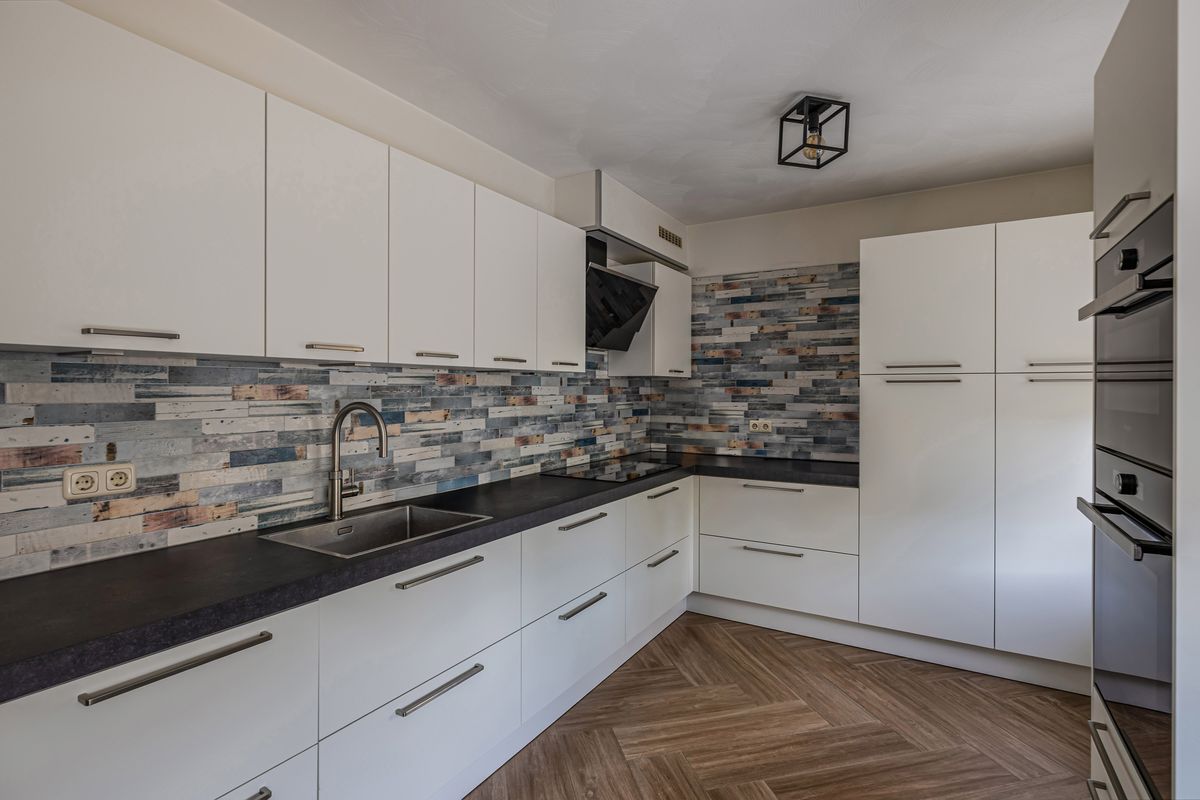 Naast de eetkamer ligt de keuken – modern, praktisch en opgezet in een royale L-vorm. De keuken is uitgerust met een oven, combimagnetron, grote koelkast en vriezer, een quooker en brede besteklades – praktisch en stijlvol tegelijk.