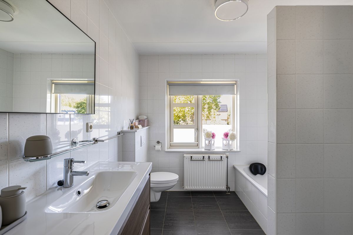 De badkamer is fris en eigentijds, met witte wandtegels tot aan het plafond, een zwarte tegelvloer en een warme houttint in het wastafelmeubel. Verder is de ruimte voorzien van een ligbad, een aparte douche met glazen wand, tweede toilet en een verwarmde spiegel waarbij ook het licht dimbaar is. De stijl sluit naadloos aan op het toilet beneden: strak, modern en goed onderhouden.