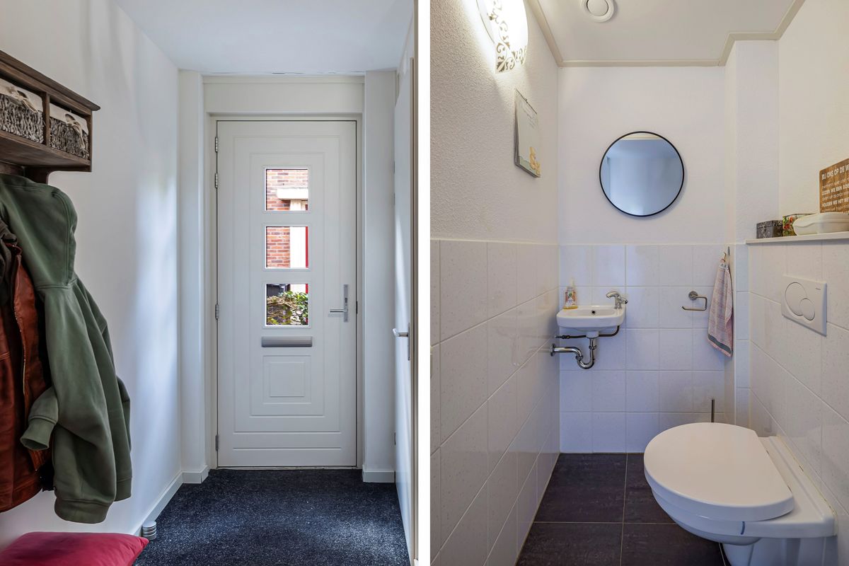Zodra je de voordeur opent, voel je het: dit is een huis waar over is nagedacht. De hal is ruim en verzorgd, met plek voor jassen, schoenen en een fijne spiegelwand die de ruimte nog groter laat lijken. De zwarte tussendeur met glas geeft alvast een voorproefje van wat je verderop te wachten staat. Links het toilet, strak wit met zwarte tegelvloer, en de trap naar boven, rechtdoor de doorgang naar de woonkamer.