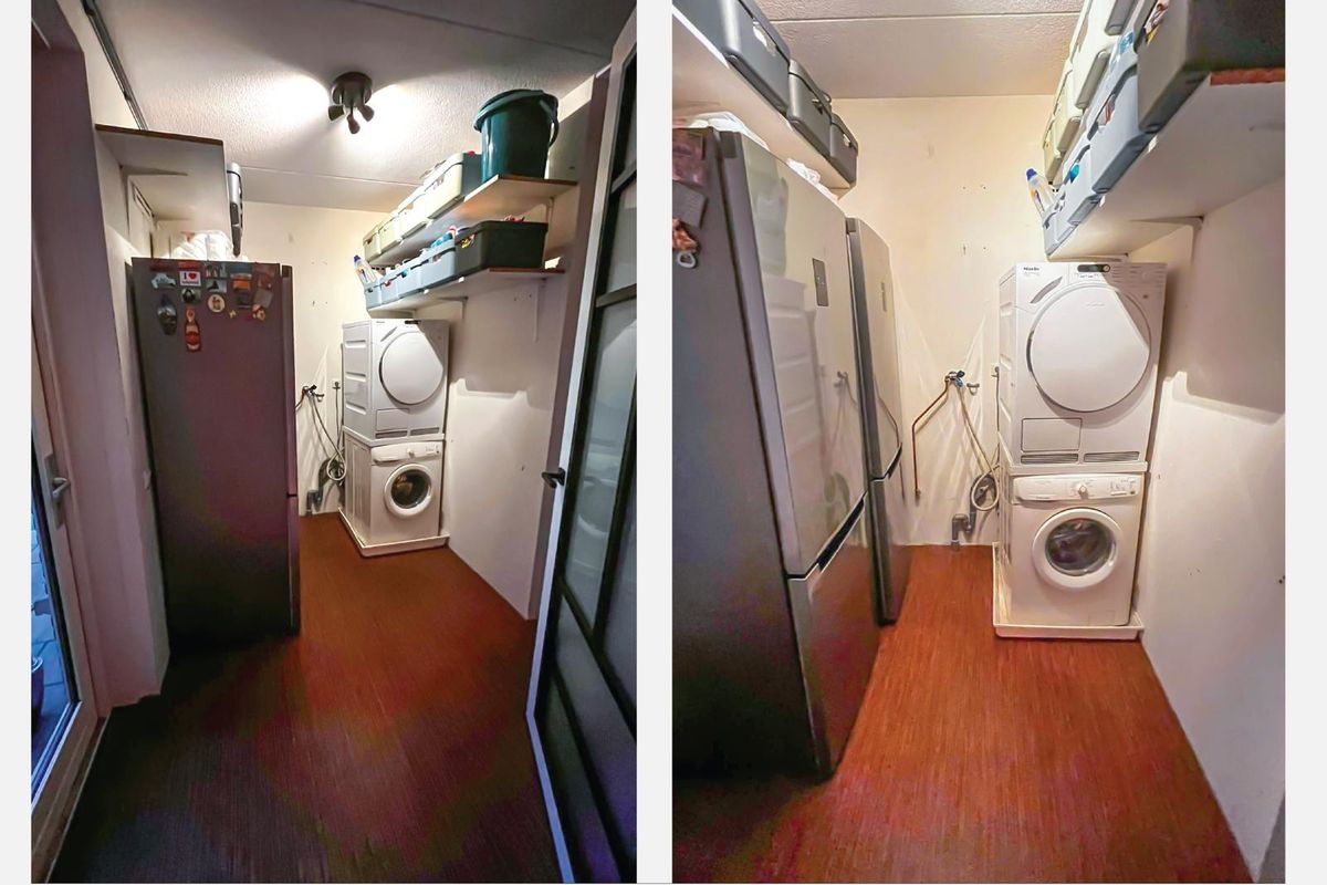 Aansluitend aan de woonkamer vind je de bijkeuken: een ideale overgang tussen binnen en buiten. Hier staan de wasmachine en droger, er is volop bergruimte en via de achterdeur loop je binnendoor naar de garage. Die verbinding maakt het huis niet alleen praktisch, maar ook comfortabel – zeker op regenachtige dagen of wanneer je thuiskomt met volle boodschappentassen.