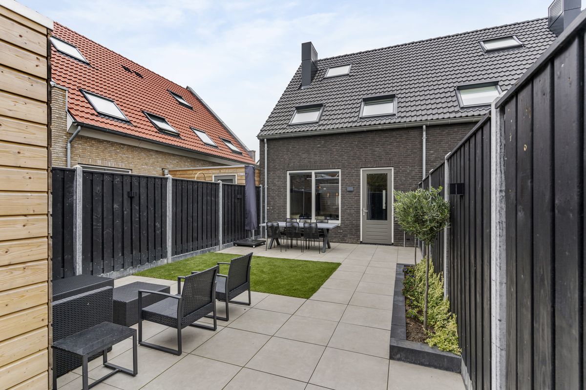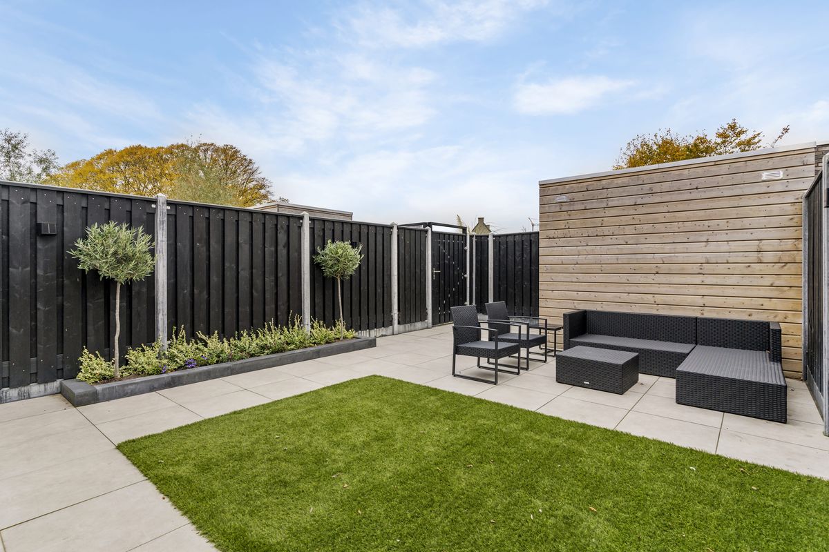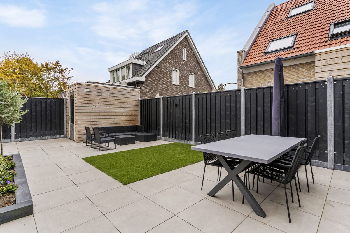 Via de woonkamer heb je toegang tot de fraai aangelegde achtertuin gelegen op het zonnige zuidoosten. Deze is grotendeels betegeld, beschikt over een net gazon en heeft achterin een vrijstaande houten berging. Een ideale buitenruimte met weinig onderhoud én veel gebruiksgemak. Ook is er een achterpoort aanwezig.