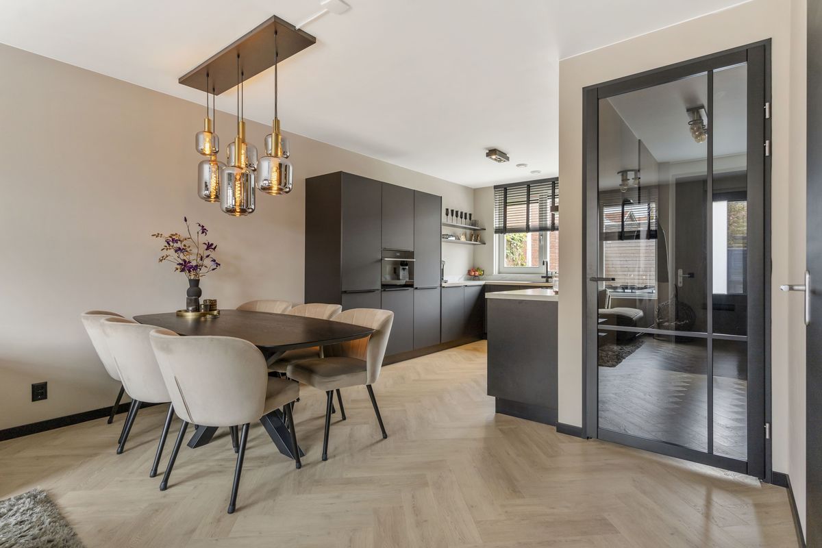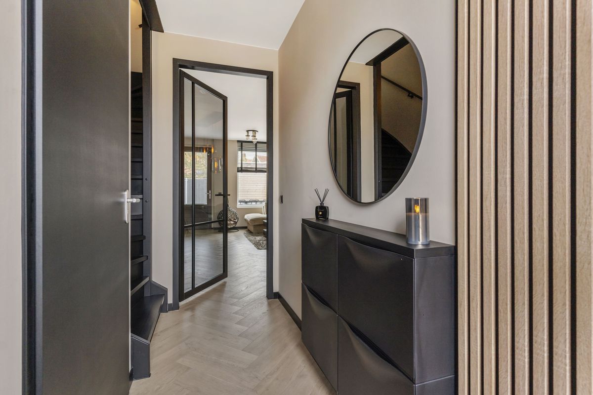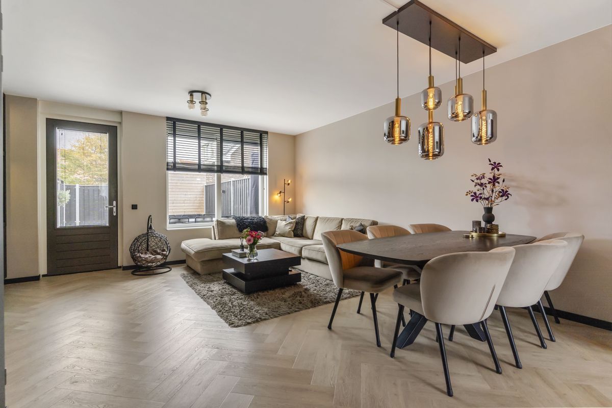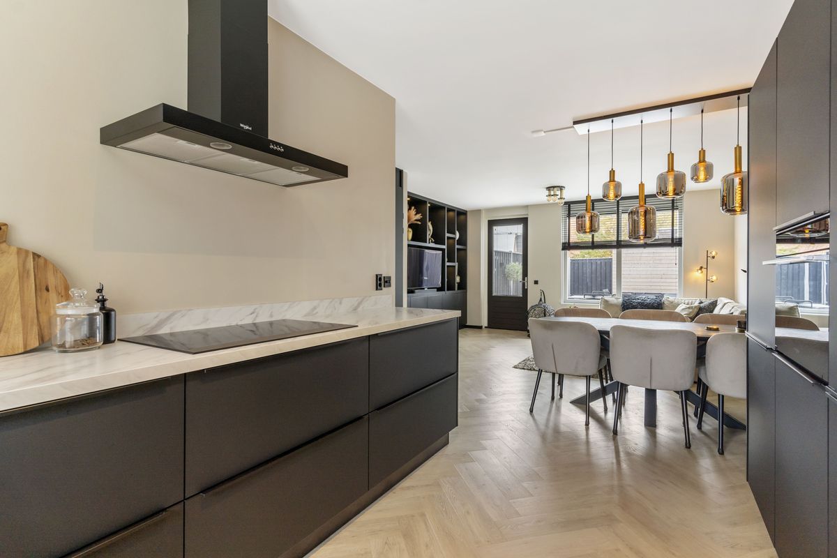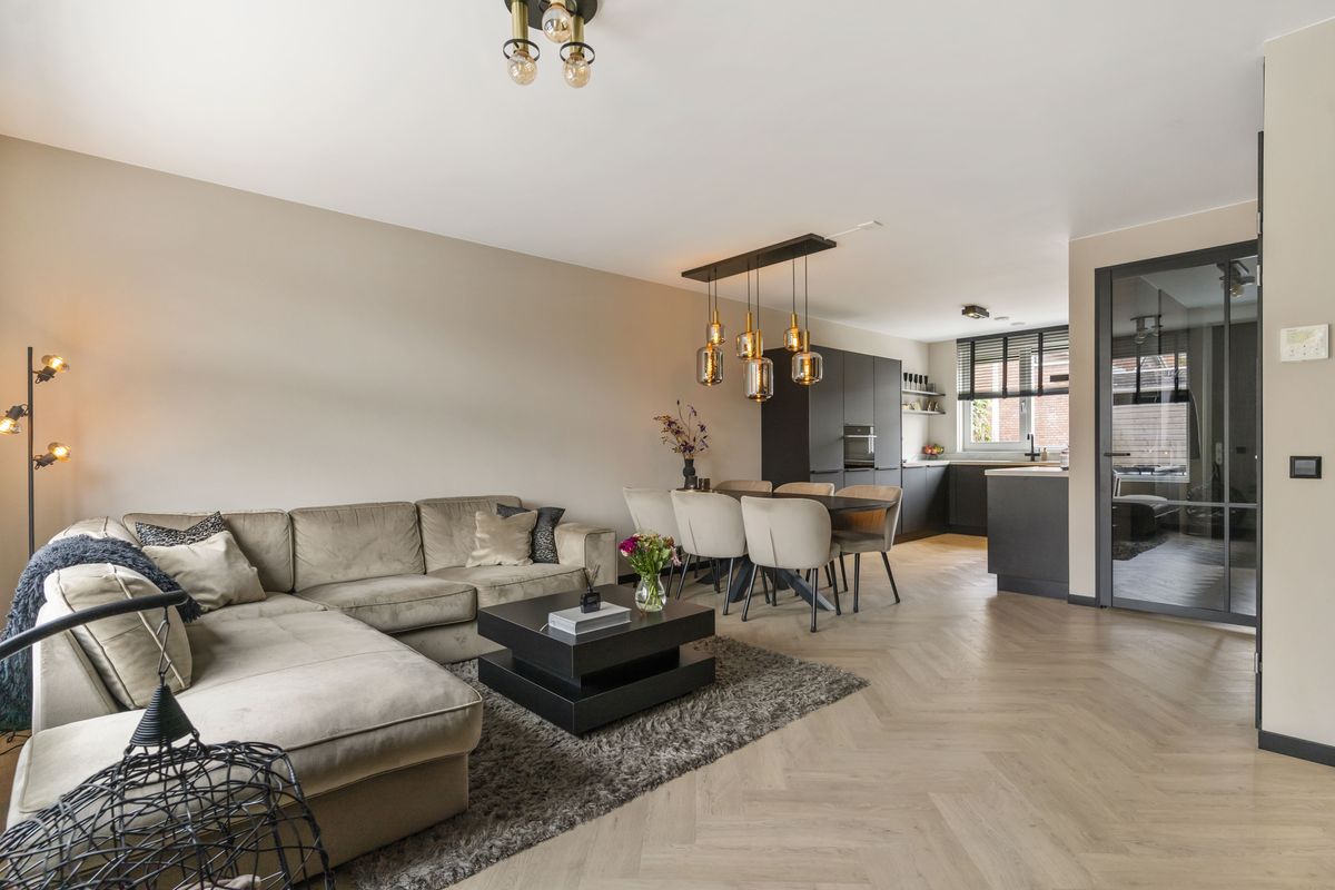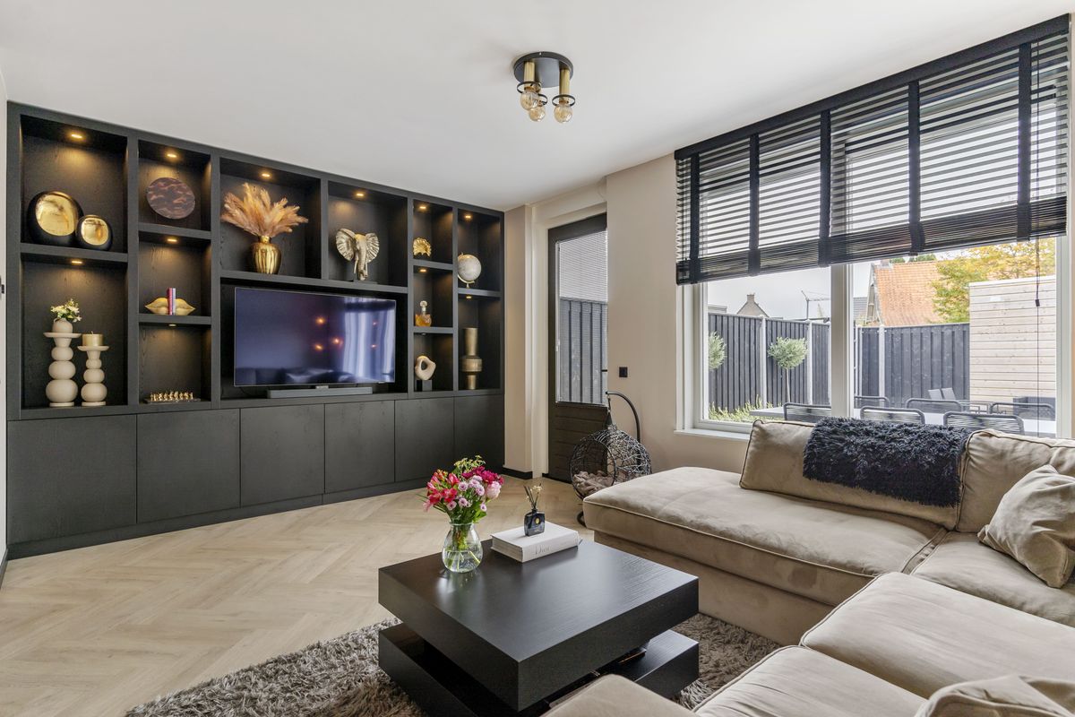 De ruime en lichte woonkamer zijn strak afgewerkt met onder andere een visgraat pvc-vloer, zwarte plinten en een op maat gemaakt tv-meubel (beschikbaar ter overname).