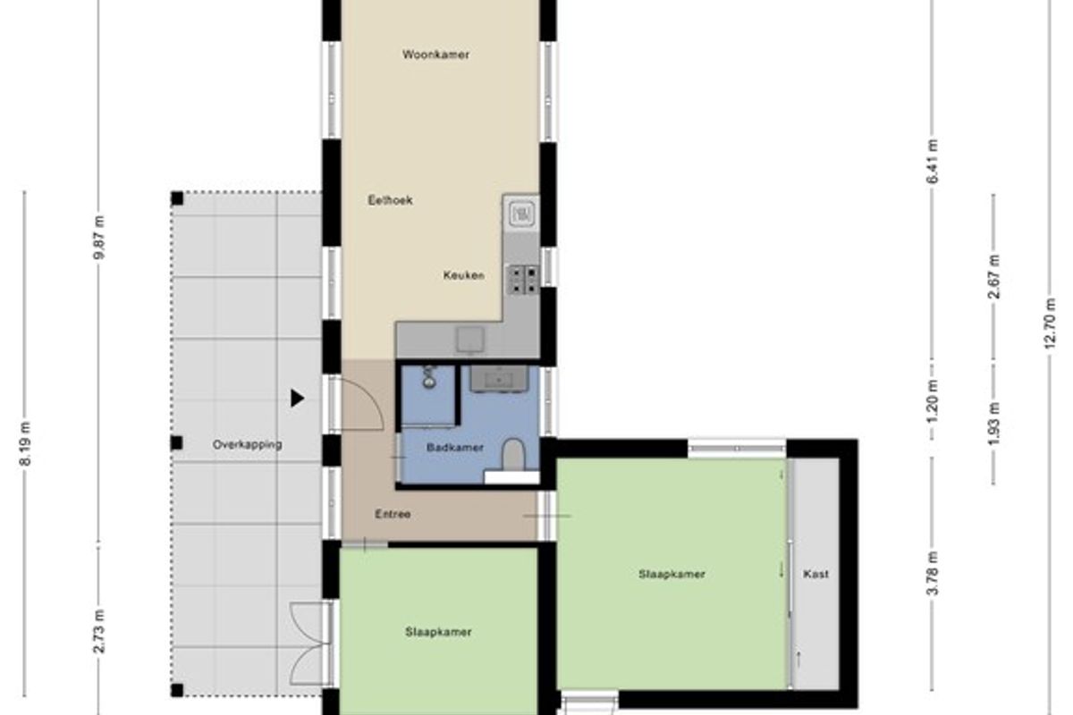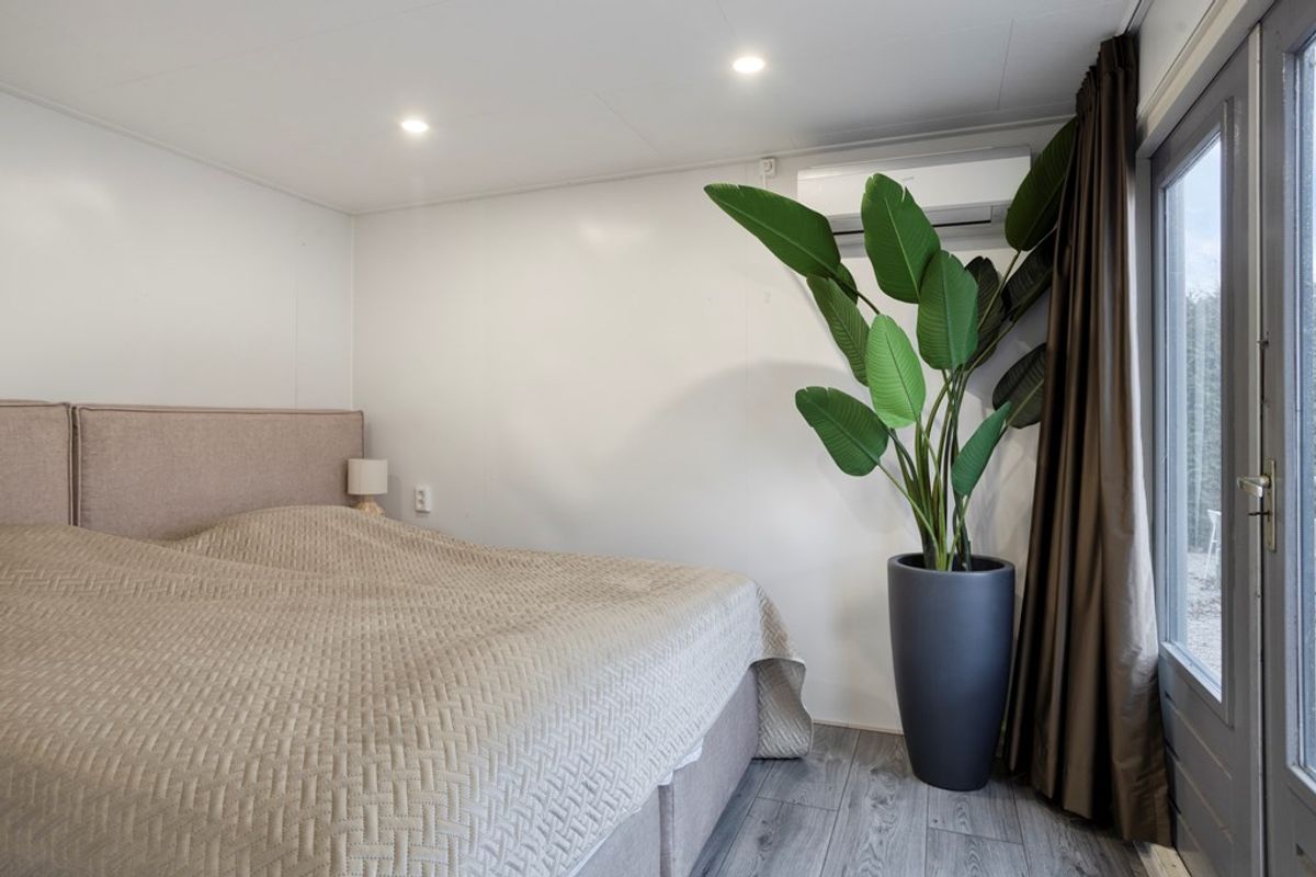 Via de entree betreedt u de woning. De woonkamer met open keuken vormt een lichte en open leefruimte en is praktisch ingedeeld. De keuken staat in directe verbinding met het woongedeelte, wat zorgt voor een prettige, ruimtelijke sfeer. Het chalet beschikt verder over twee slaapkamers en een badkamer, allemaal gelijkvloers en functioneel ingedeeld.